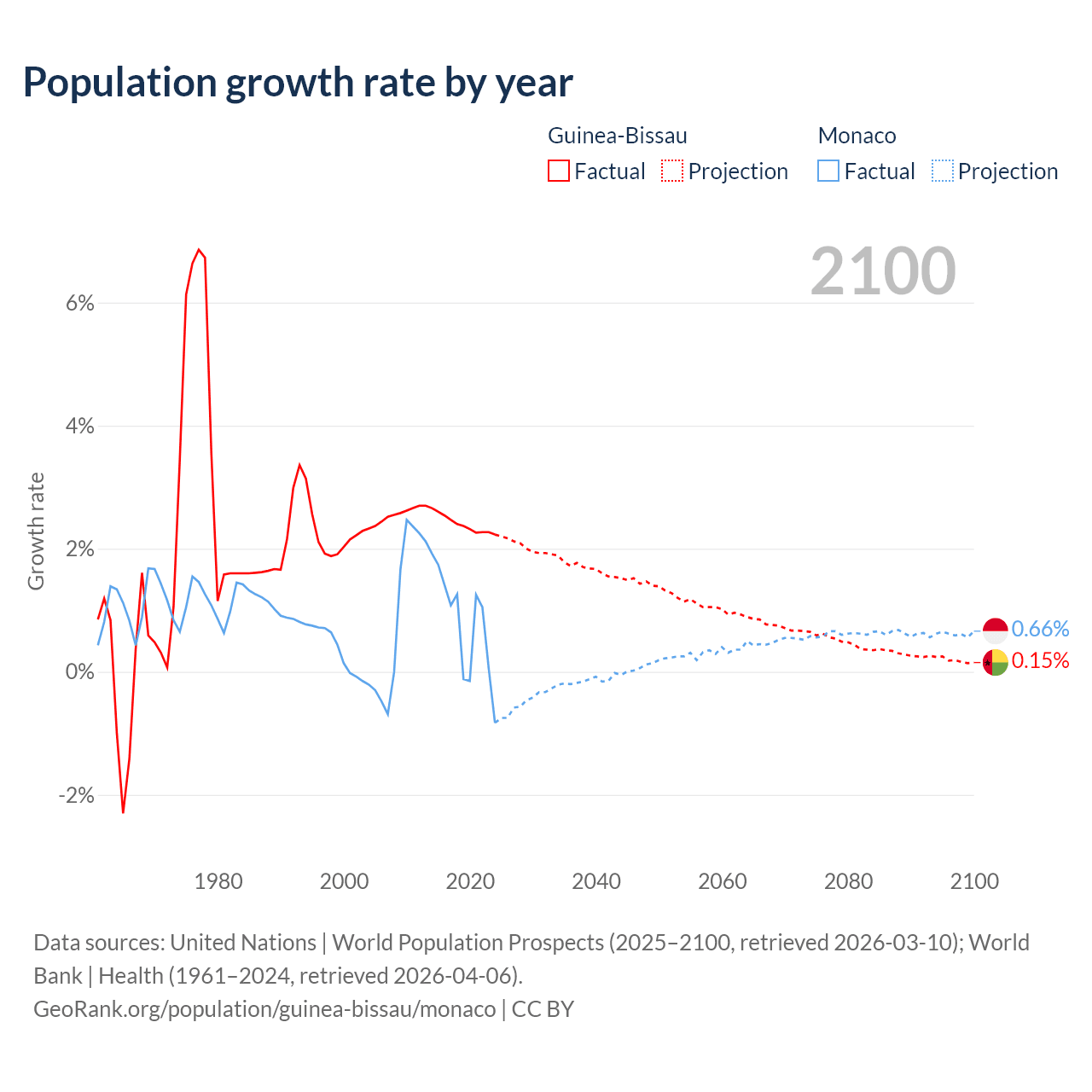 - For the last 10 years, Guinea-Bissau has had an average growth rate of +2.4% per year vs +0.79% in Monaco.