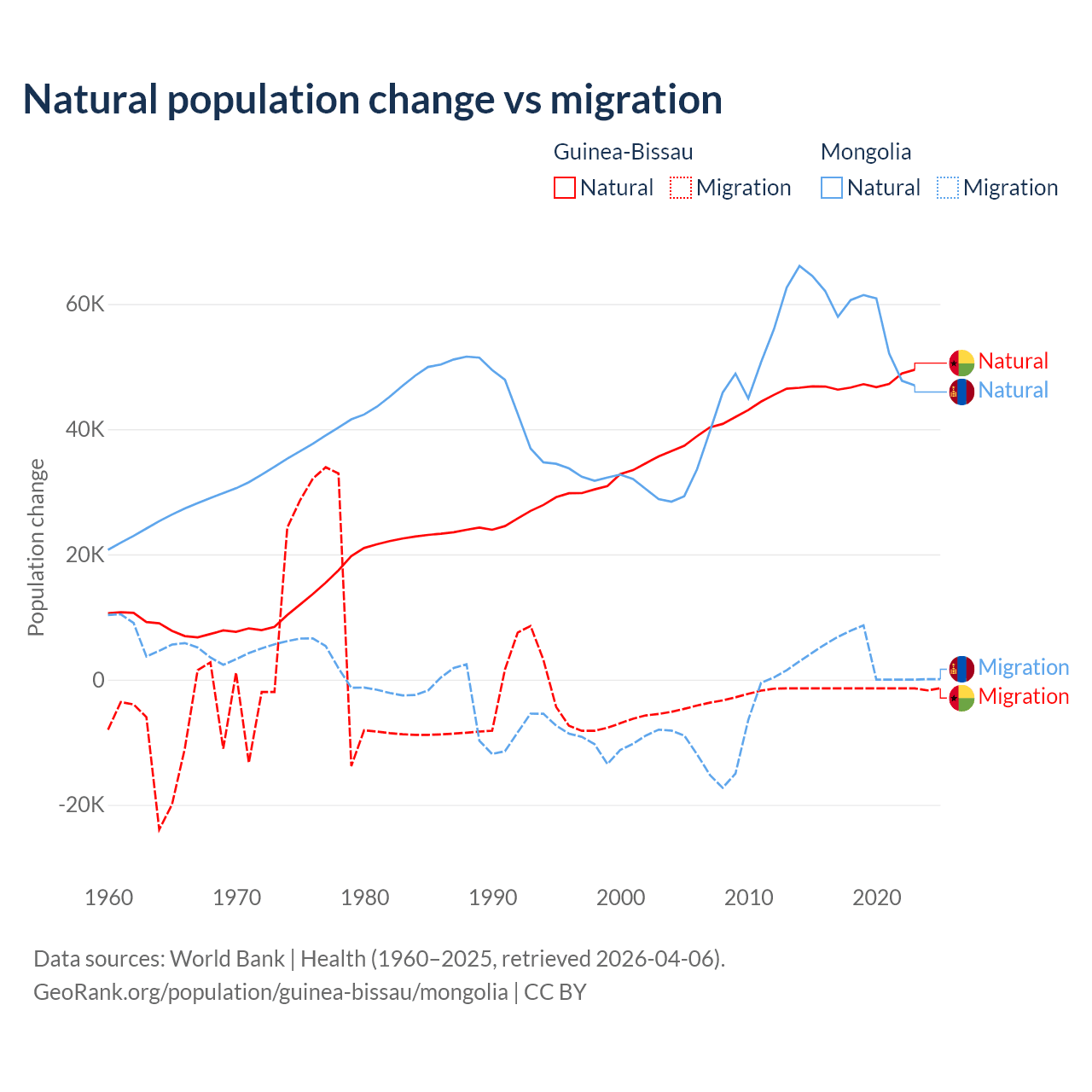 Over the last 10 years, 97.1% of the population change in Guinea-Bissau is from natural causes (a gain of 472,826 people) and 2.87% is from migration (a loss of 13,956 people). In Mongolia 94.1% is from natural causes (a gain of 580,367 people) and 5.87% is from migration (a gain of 36,163 people).