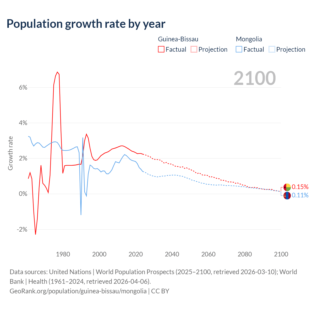 - For the last 10 years, Guinea-Bissau has had an average growth rate of +2.4% per year vs +1.79% in Mongolia.