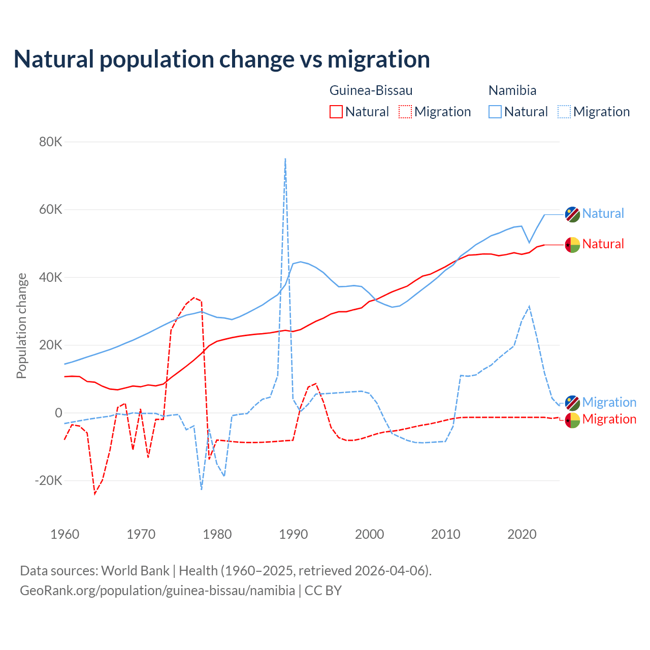 Over the last 10 years, 97.1% of the population change in Guinea-Bissau is from natural causes (a gain of 472,826 people) and 2.87% is from migration (a loss of 13,956 people). In Namibia 74.3% is from natural causes (a gain of 532,532 people) and 25.7% is from migration (a gain of 183,837 people).