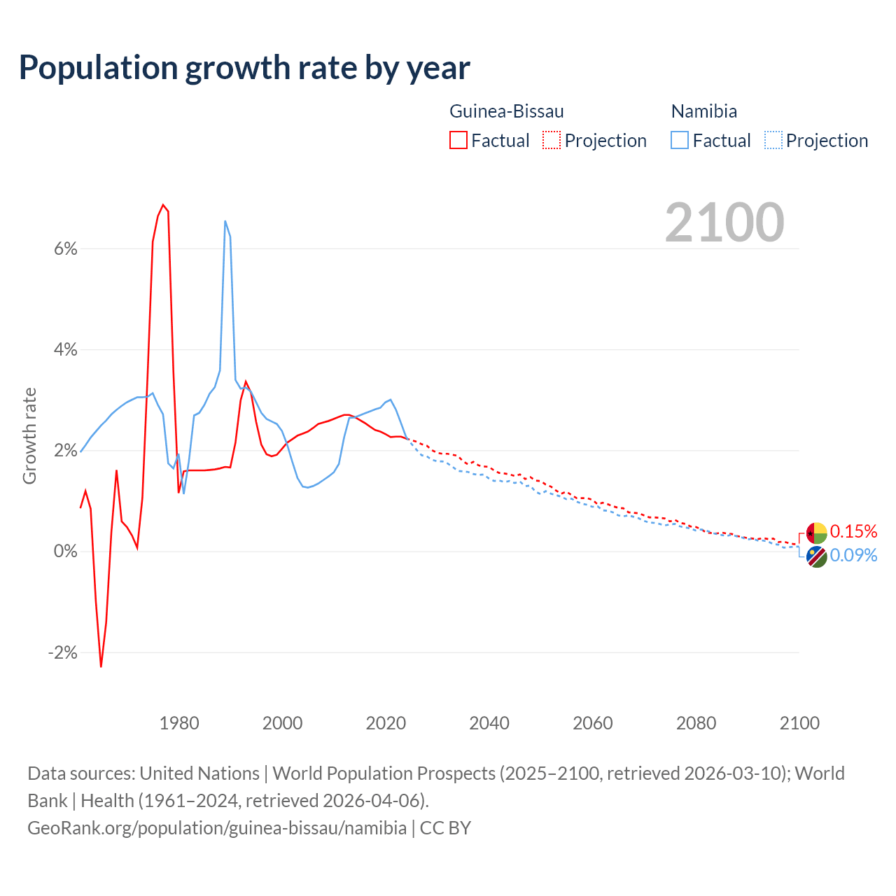 - For the last 10 years, Guinea-Bissau has had an average growth rate of +2.4% per year vs +2.73% in Namibia.