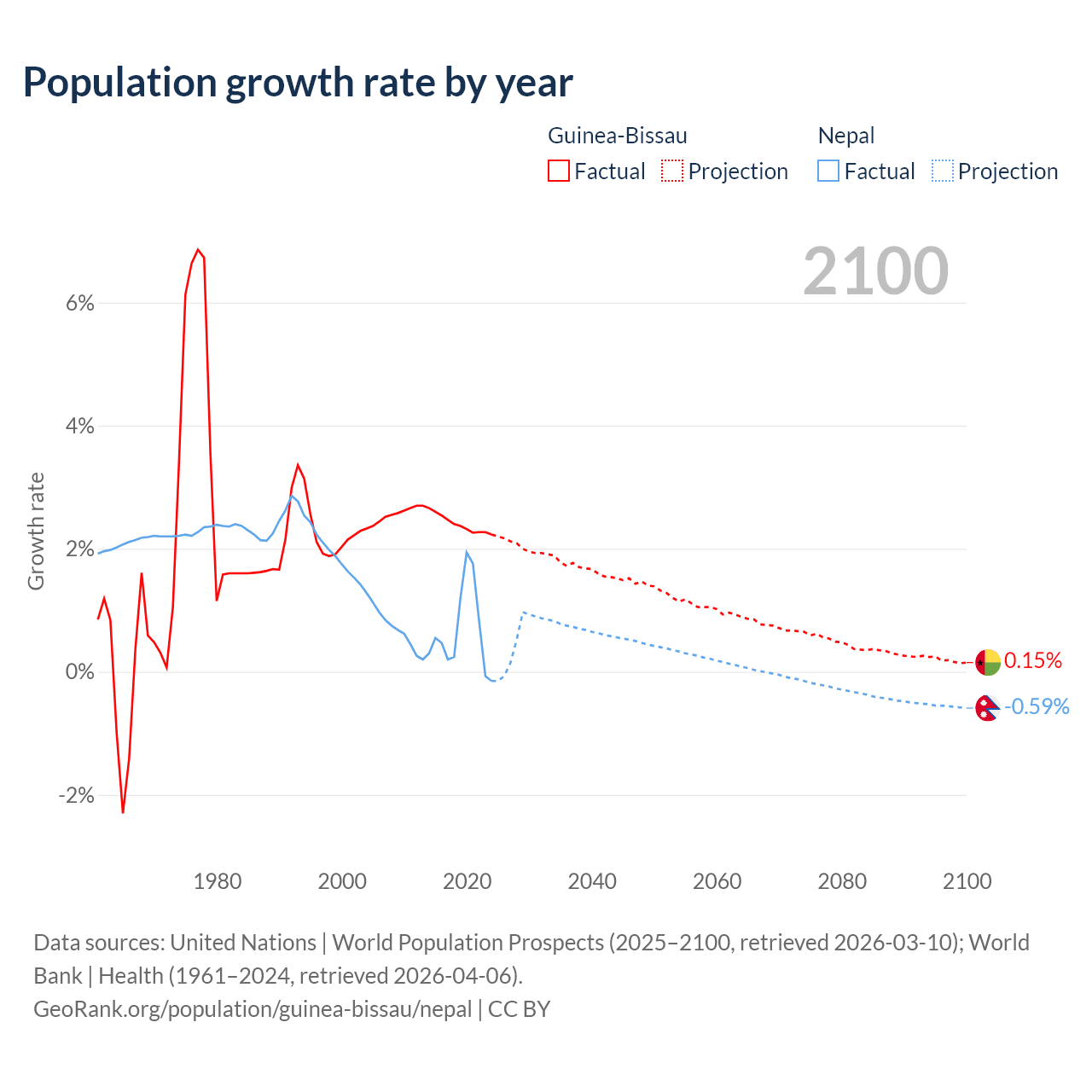 Guinea-Bissau vs Nepal: population by year and forecast