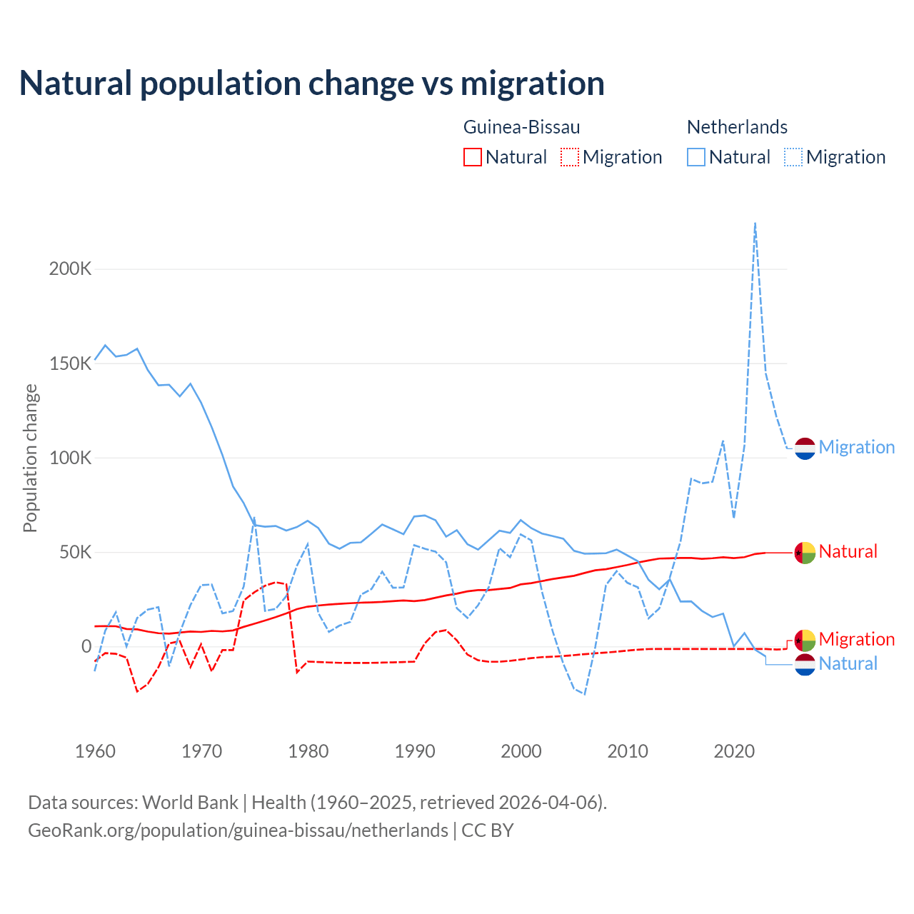 Over the last 10 years, 97.1% of the population change in Guinea-Bissau is from natural causes (a gain of 472,826 people) and 2.87% is from migration (a loss of 13,956 people). In the Netherlands 11.8% is from natural causes (a gain of 134,554 people) and 88.2% is from migration (a gain of 1,006,495 people).