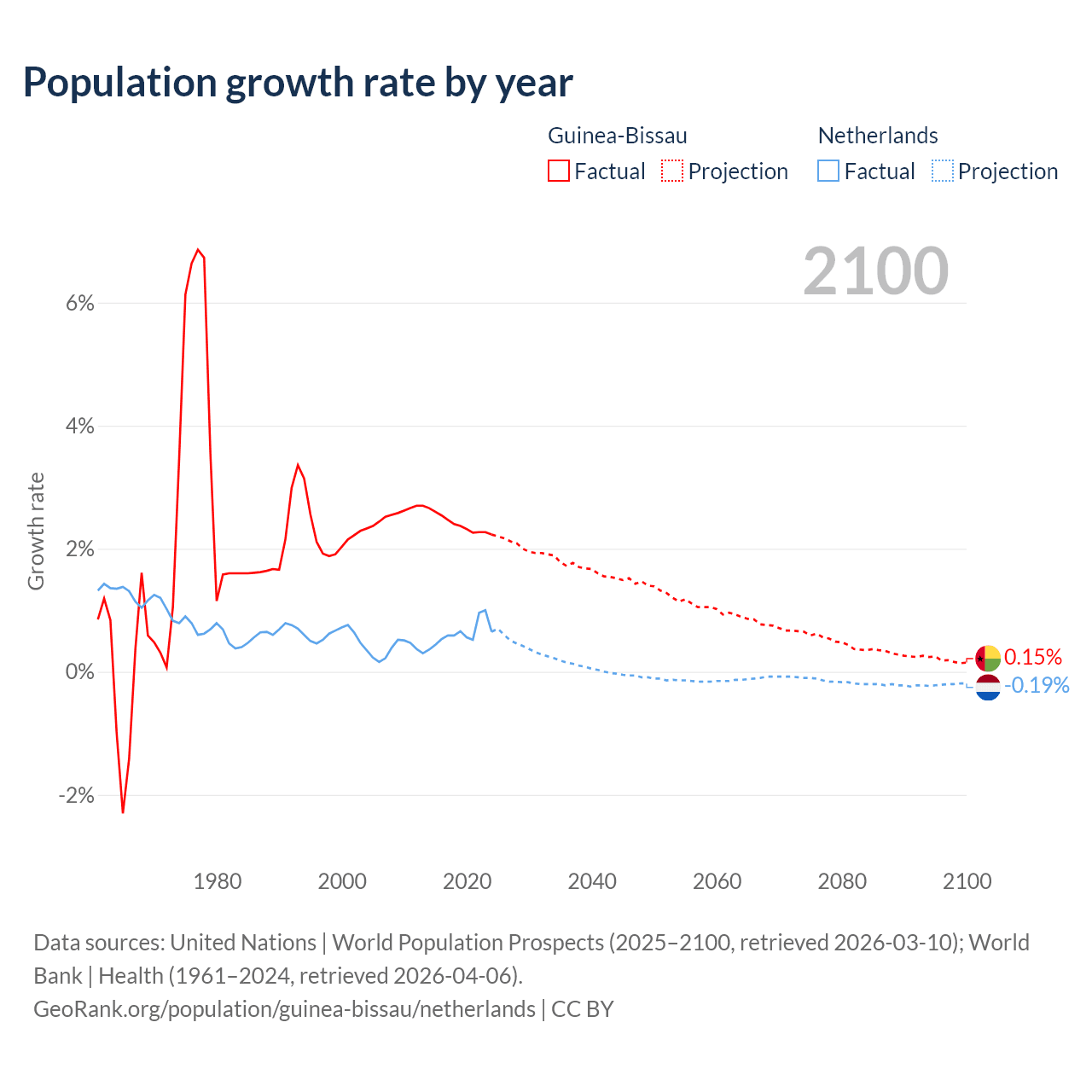 - For the last 10 years, Guinea-Bissau has had an average growth rate of +2.4% per year vs +0.62% in the Netherlands.