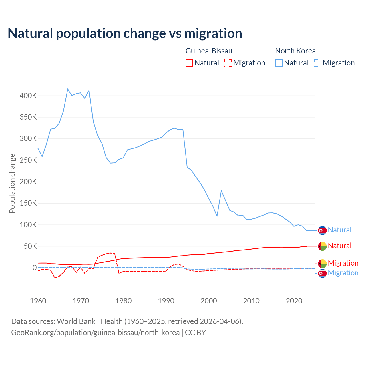 Over the last 10 years, 97.1% of the population change in Guinea-Bissau is from natural causes (a gain of 472,826 people) and 2.87% is from migration (a loss of 13,956 people). In North Korea 97.7% is from natural causes (a gain of 1,097,372 people) and 2.33% is from migration (a loss of 26,227 people).