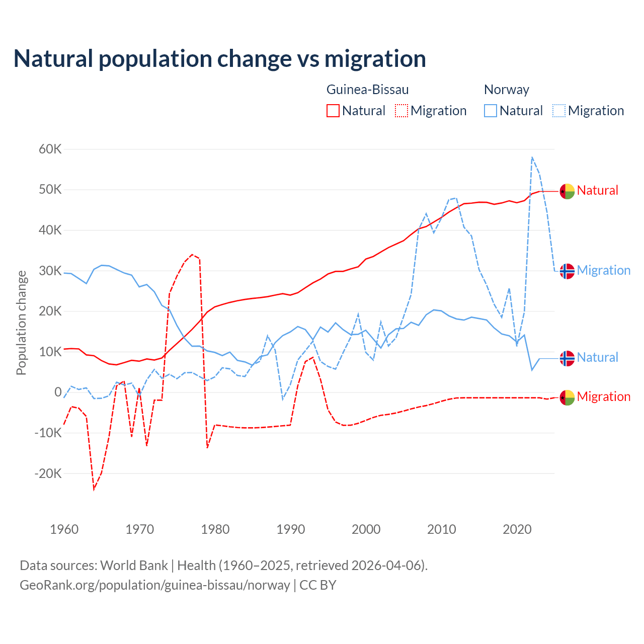 Over the last 10 years, 97.1% of the population change in Guinea-Bissau is from natural causes (a gain of 472,826 people) and 2.87% is from migration (a loss of 13,956 people). In Norway 31.3% is from natural causes (a gain of 138,699 people) and 68.7% is from migration (a gain of 303,945 people).