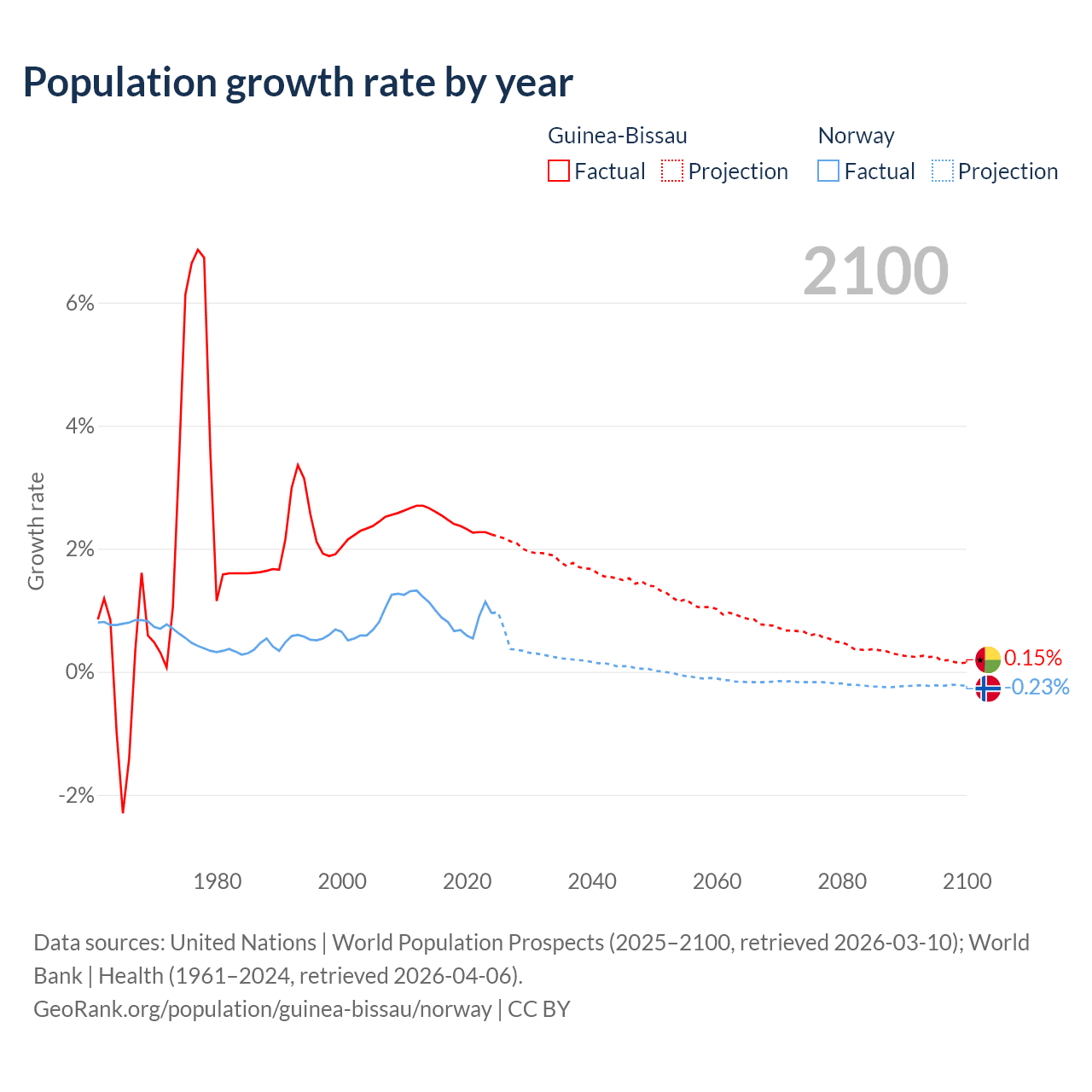 - For the last 10 years, Guinea-Bissau has had an average growth rate of +2.4% per year vs +0.85% in Norway.