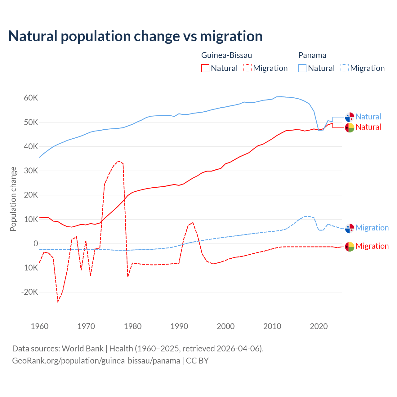 Over the last 10 years, 97.1% of the population change in Guinea-Bissau is from natural causes (a gain of 472,826 people) and 2.87% is from migration (a loss of 13,956 people). In Panama 86.5% is from natural causes (a gain of 544,211 people) and 13.5% is from migration (a gain of 84,849 people).