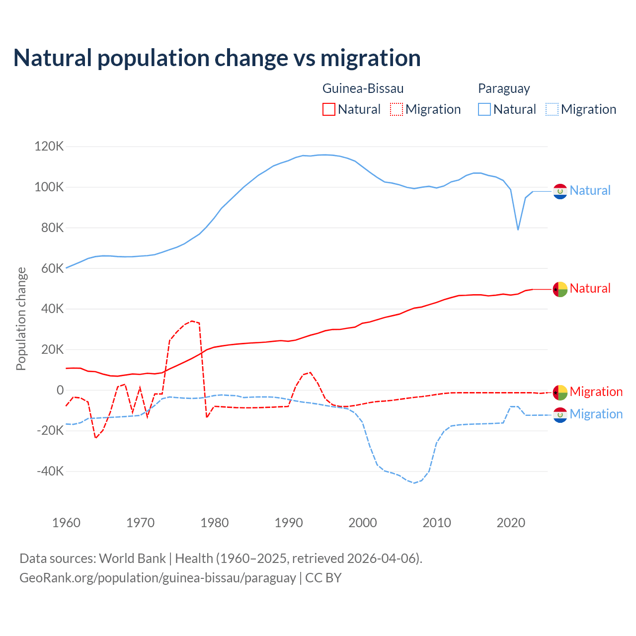 Over the last 10 years, 97.1% of the population change in Guinea-Bissau is from natural causes (a gain of 472,826 people) and 2.87% is from migration (a loss of 13,956 people). In Paraguay 87.6% is from natural causes (a gain of 1,002,636 people) and 12.4% is from migration (a loss of 141,377 people).