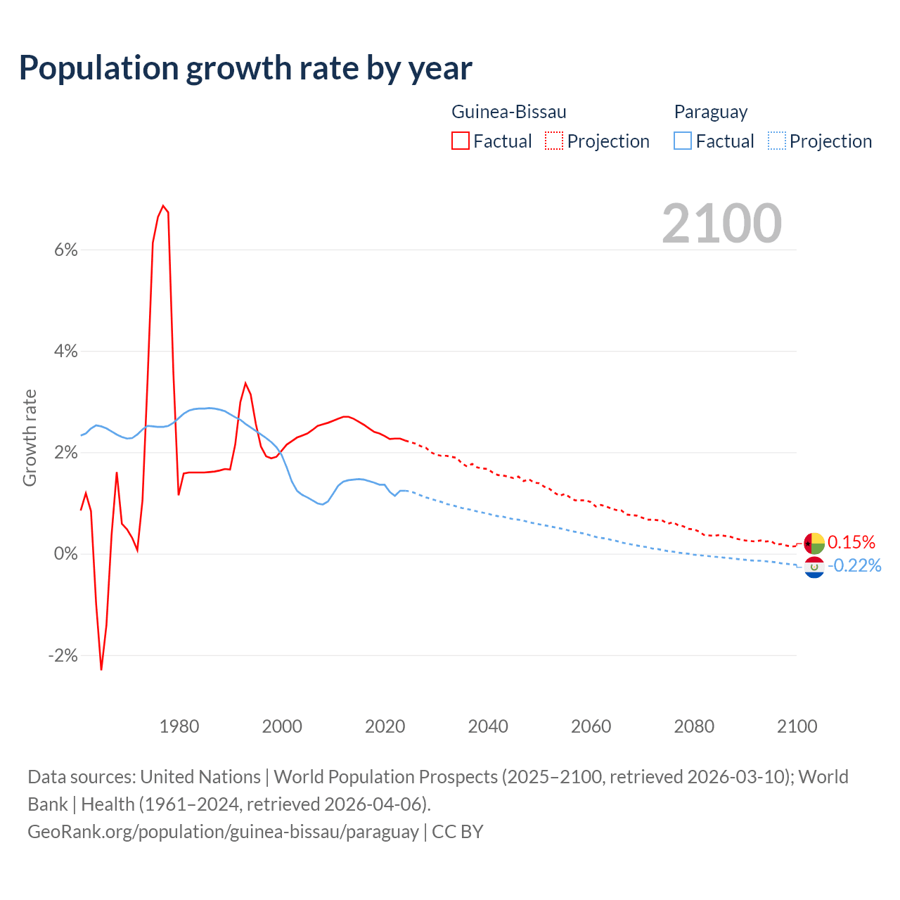 - For the last 10 years, Guinea-Bissau has had an average growth rate of +2.4% per year vs +1.34% in Paraguay.