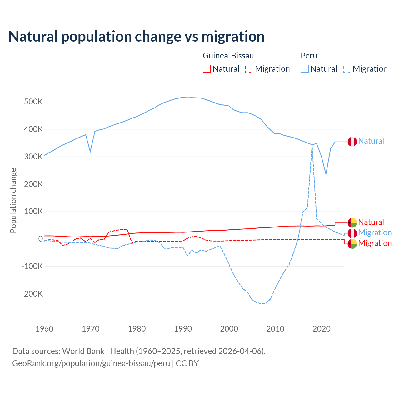 Over the last 10 years, 97.1% of the population change in Guinea-Bissau is from natural causes (a gain of 472,826 people) and 2.87% is from migration (a loss of 13,956 people). In Peru 82% is from natural causes (a gain of 3,345,822 people) and 18% is from migration (a gain of 732,505 people).