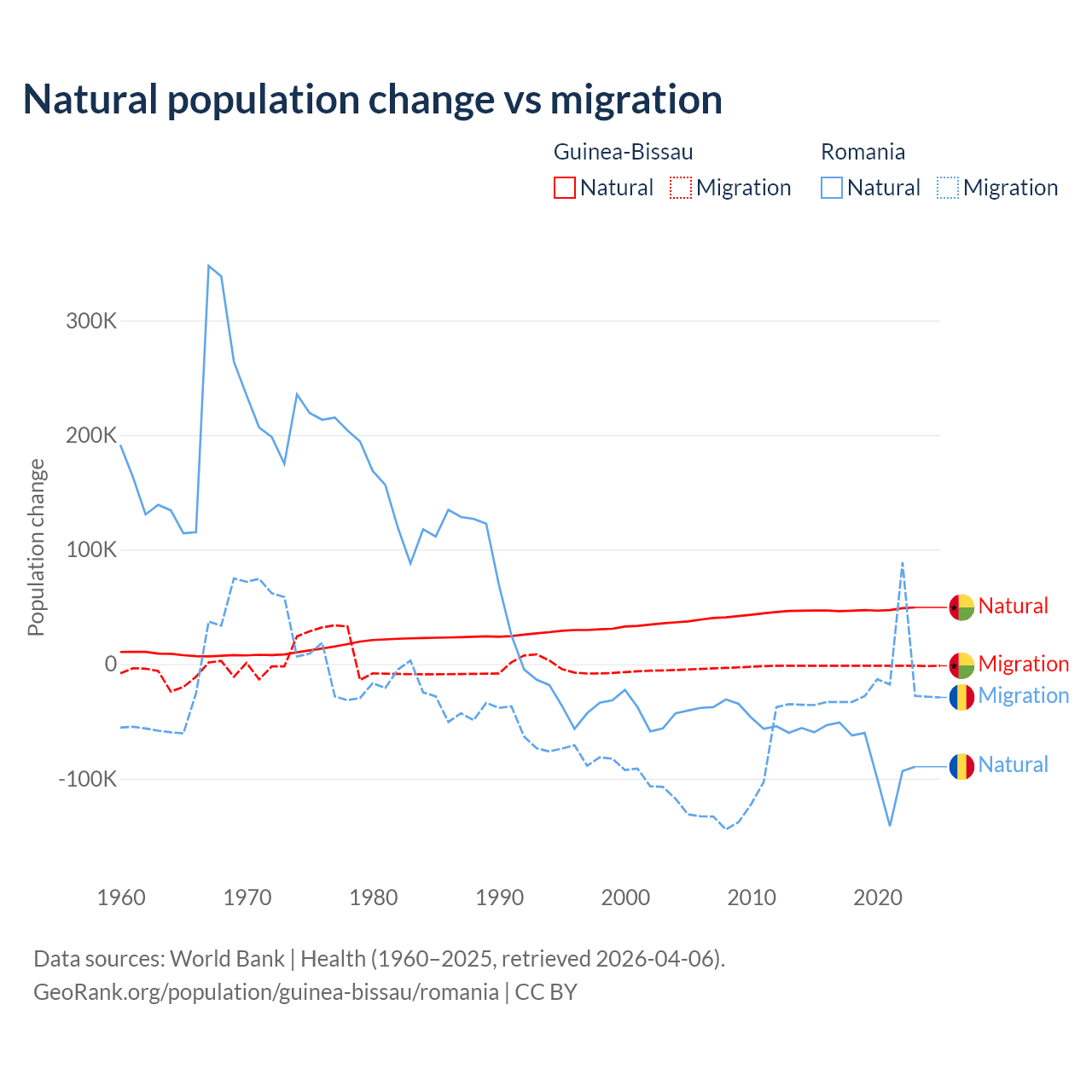 Over the last 10 years, 97.1% of the population change in Guinea-Bissau is from natural causes (a gain of 472,826 people) and 2.87% is from migration (a loss of 13,956 people). In Romania 82% is from natural causes (a loss of 766,295 people) and 18% is from migration (a loss of 167,917 people).