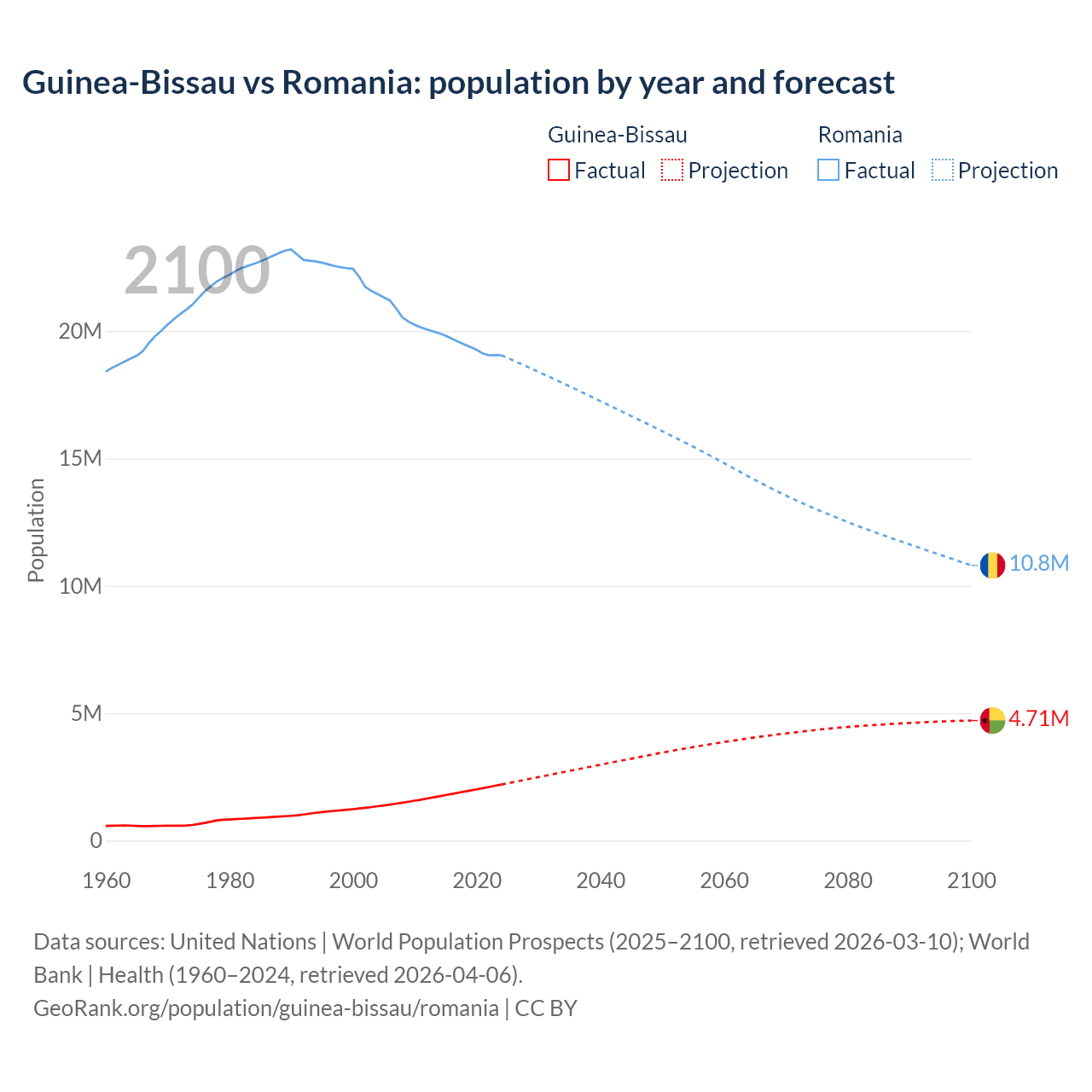 - Since 2006, the population of Guinea-Bissau has increased from 1.42M people to 2.31M (63.4% growth), while Romania has declined from 21.2M to 18.8M (11.1% decline).