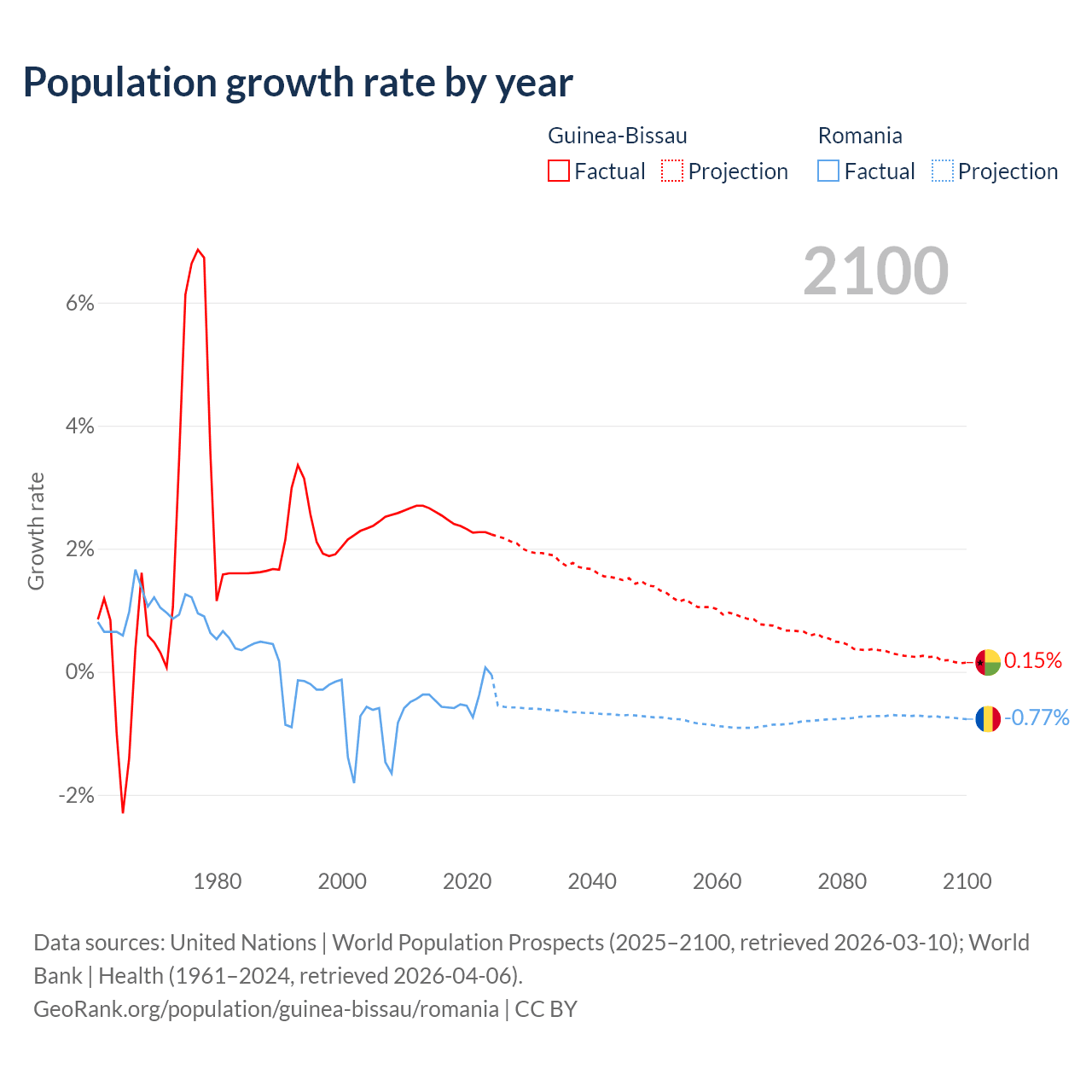 - For the last 10 years, Guinea-Bissau has had an average growth rate of +2.4% per year vs -0.43% in Romania.