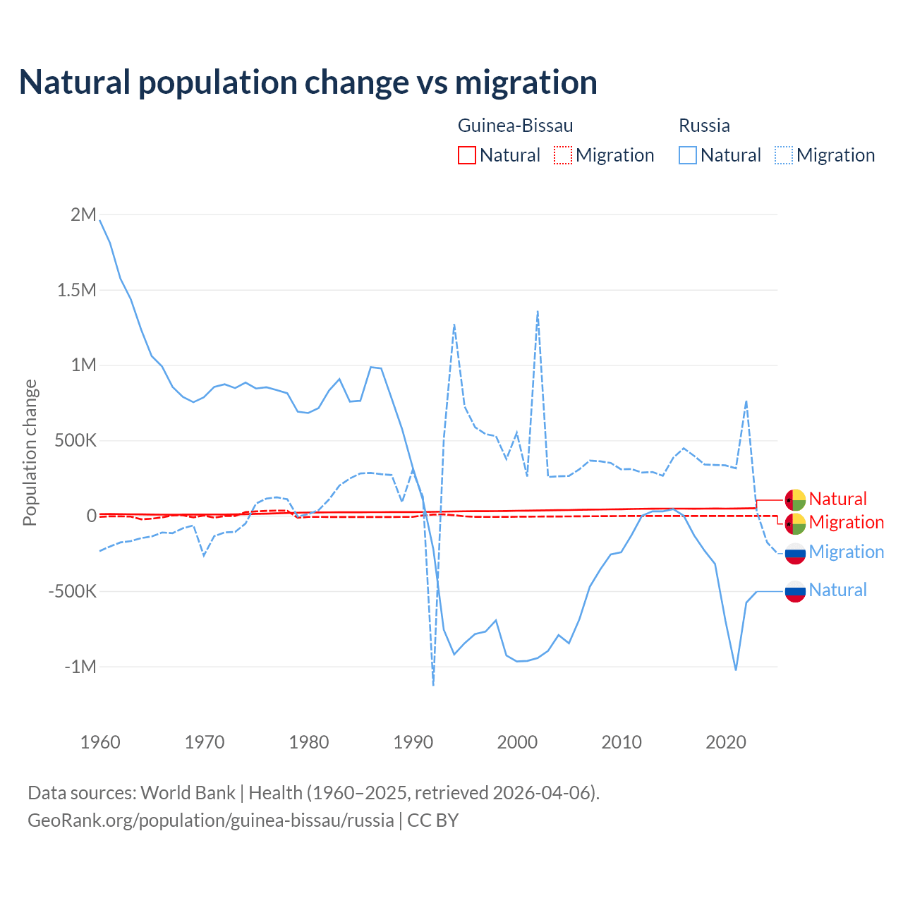 Over the last 10 years, 97.1% of the population change in Guinea-Bissau is from natural causes (a gain of 472,826 people) and 2.87% is from migration (a loss of 13,956 people). In Russia 48.6% is from natural causes (a loss of 3,416,377 people) and 51.4% is from migration (a gain of 3,611,826 people).