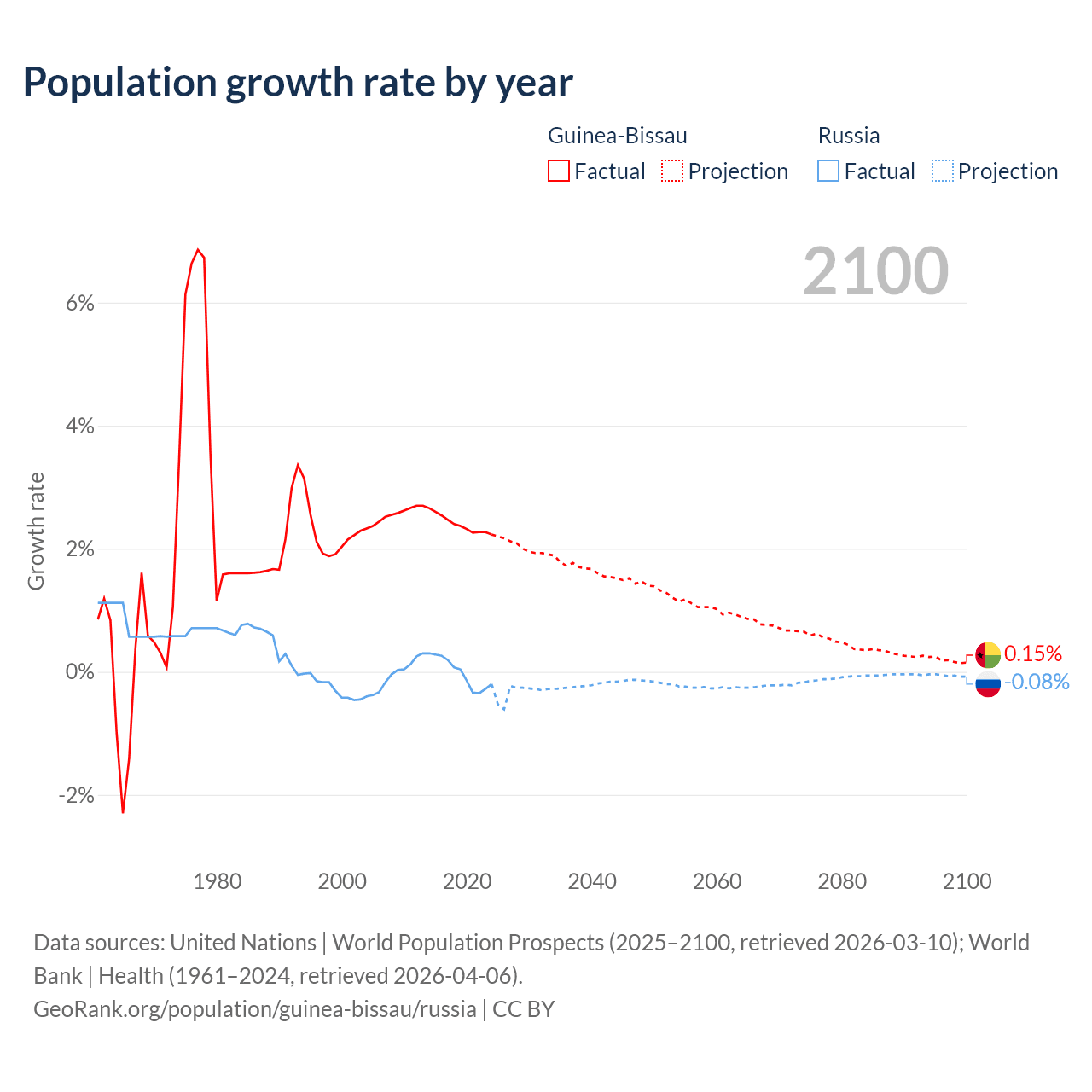 - For the last 10 years, Guinea-Bissau has had an average growth rate of +2.4% per year vs -0.02% in Russia.