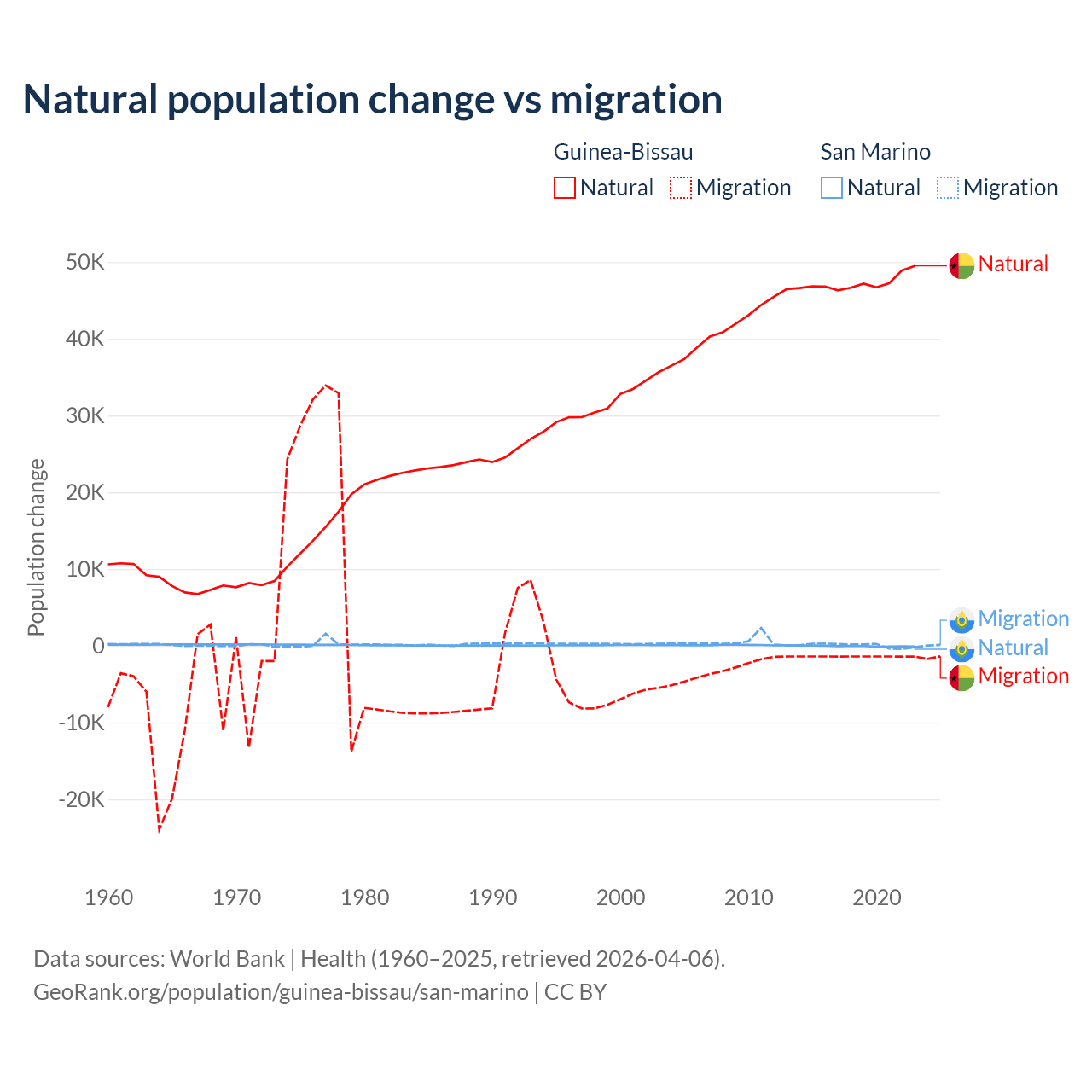 Over the last 10 years, 97.1% of the population change in Guinea-Bissau is from natural causes (a gain of 472,826 people) and 2.87% is from migration (a loss of 13,956 people). In San Marino 40.9% is from natural causes (a loss of 358 people) and 59.1% is from migration (a gain of 517 people).