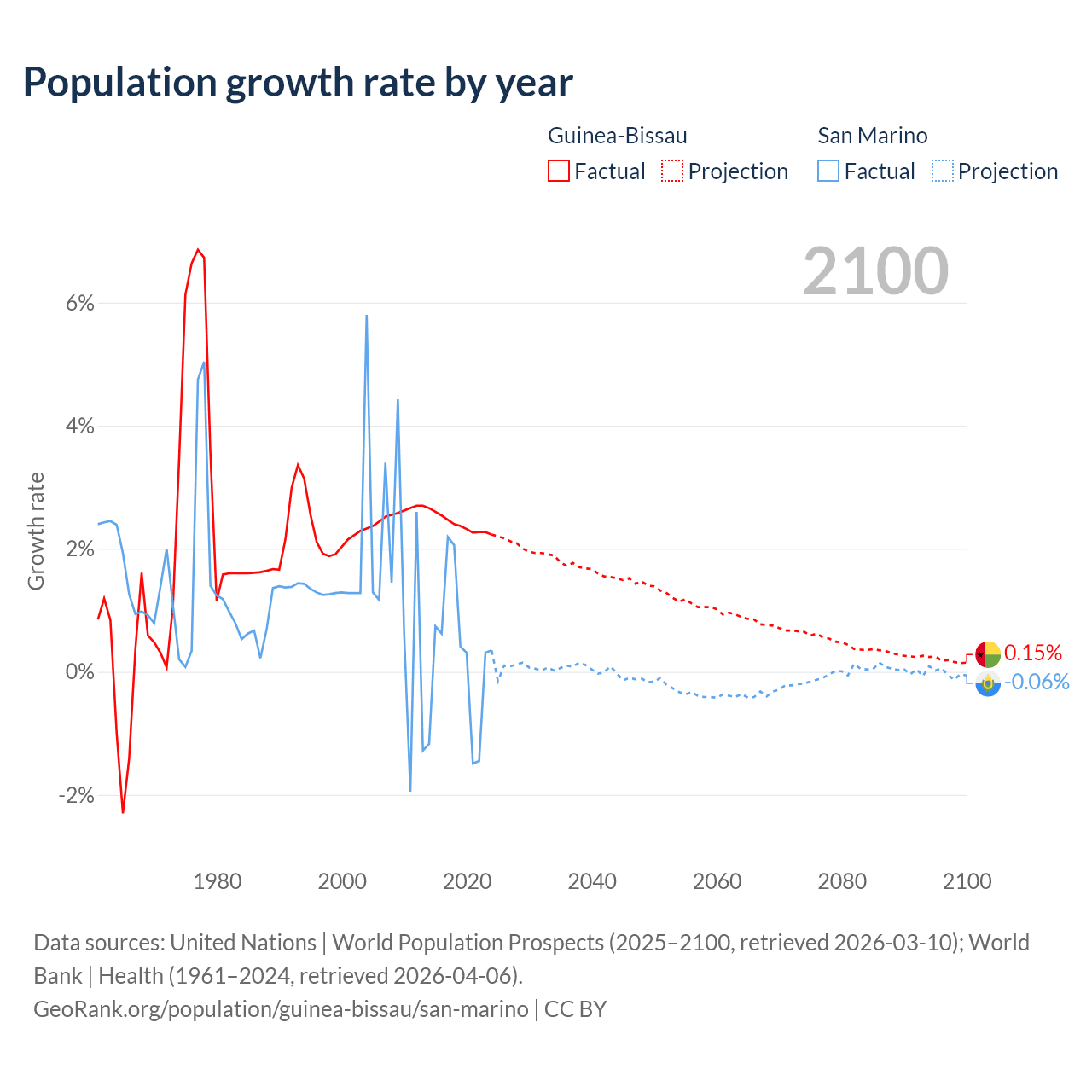 - For the last 10 years, Guinea-Bissau has had an average growth rate of +2.4% per year vs +0.26% in San Marino.
