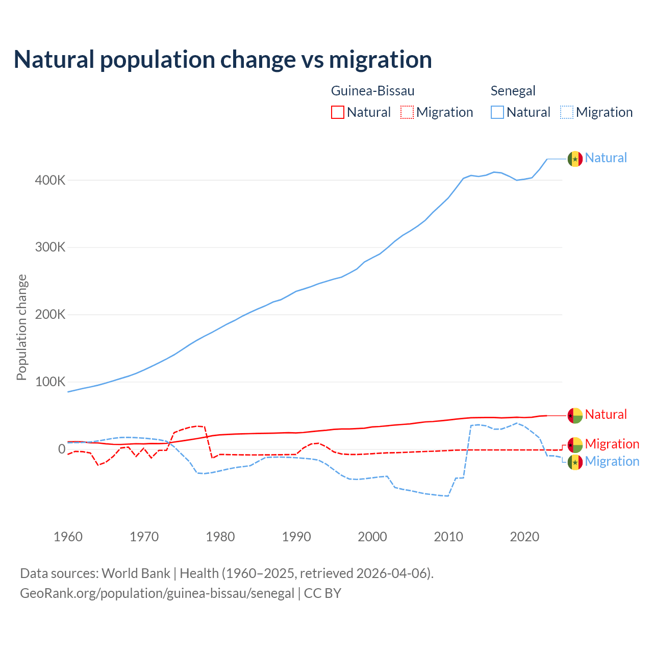 Over the last 10 years, 97.1% of the population change in Guinea-Bissau is from natural causes (a gain of 472,826 people) and 2.87% is from migration (a loss of 13,956 people). In Senegal 93.9% is from natural causes (a gain of 4,089,205 people) and 6.13% is from migration (a gain of 267,266 people).