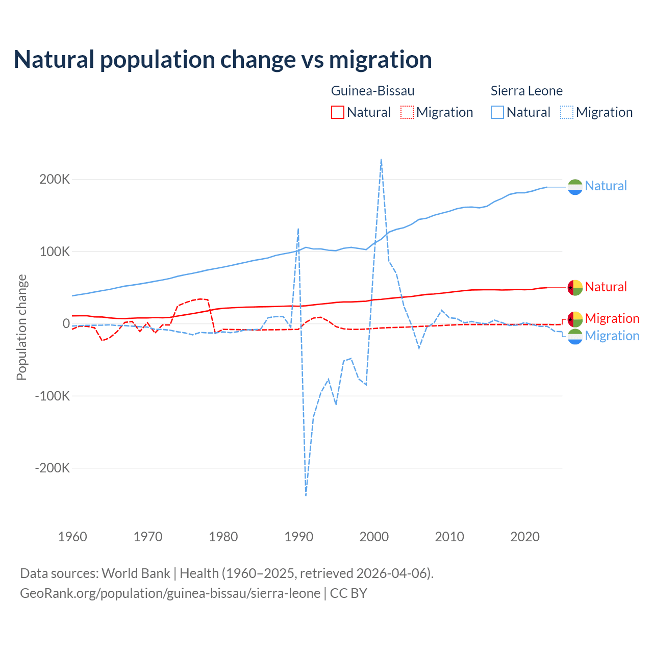 Over the last 10 years, 97.1% of the population change in Guinea-Bissau is from natural causes (a gain of 472,826 people) and 2.87% is from migration (a loss of 13,956 people). In Sierra Leone 99.6% is from natural causes (a gain of 1,764,049 people) and 0.41% is from migration (a loss of 7,211 people).