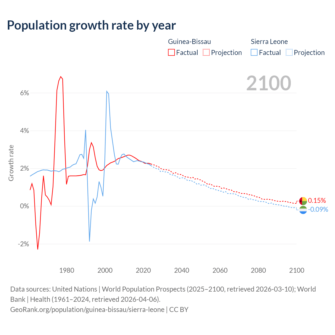 - For the last 10 years, Guinea-Bissau has had an average growth rate of +2.4% per year vs +2.32% in Sierra Leone.