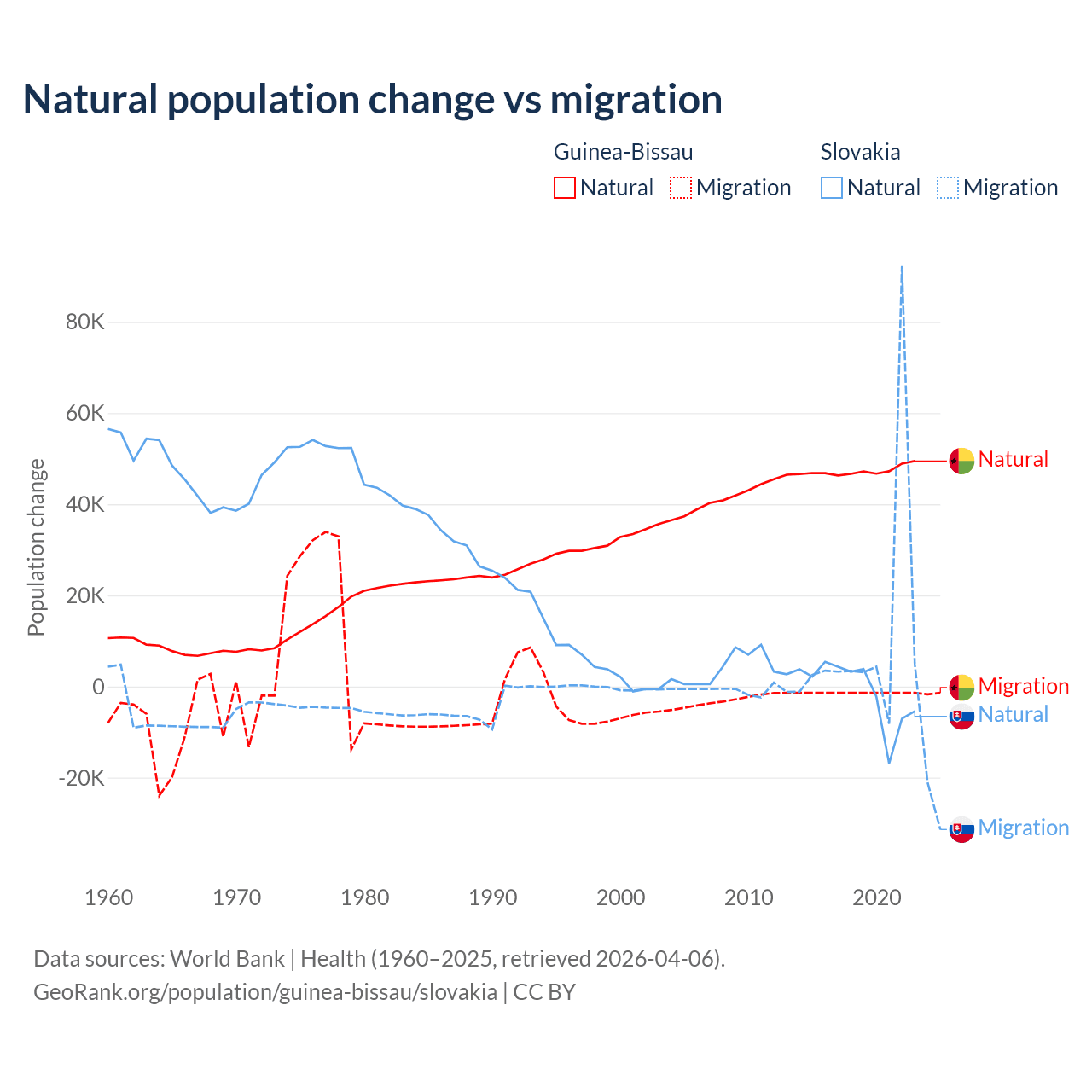 Over the last 10 years, 97.1% of the population change in Guinea-Bissau is from natural causes (a gain of 472,826 people) and 2.87% is from migration (a loss of 13,956 people). In Slovakia 7.47% is from natural causes (a loss of 8,728 people) and 92.5% is from migration (a gain of 108,156 people).