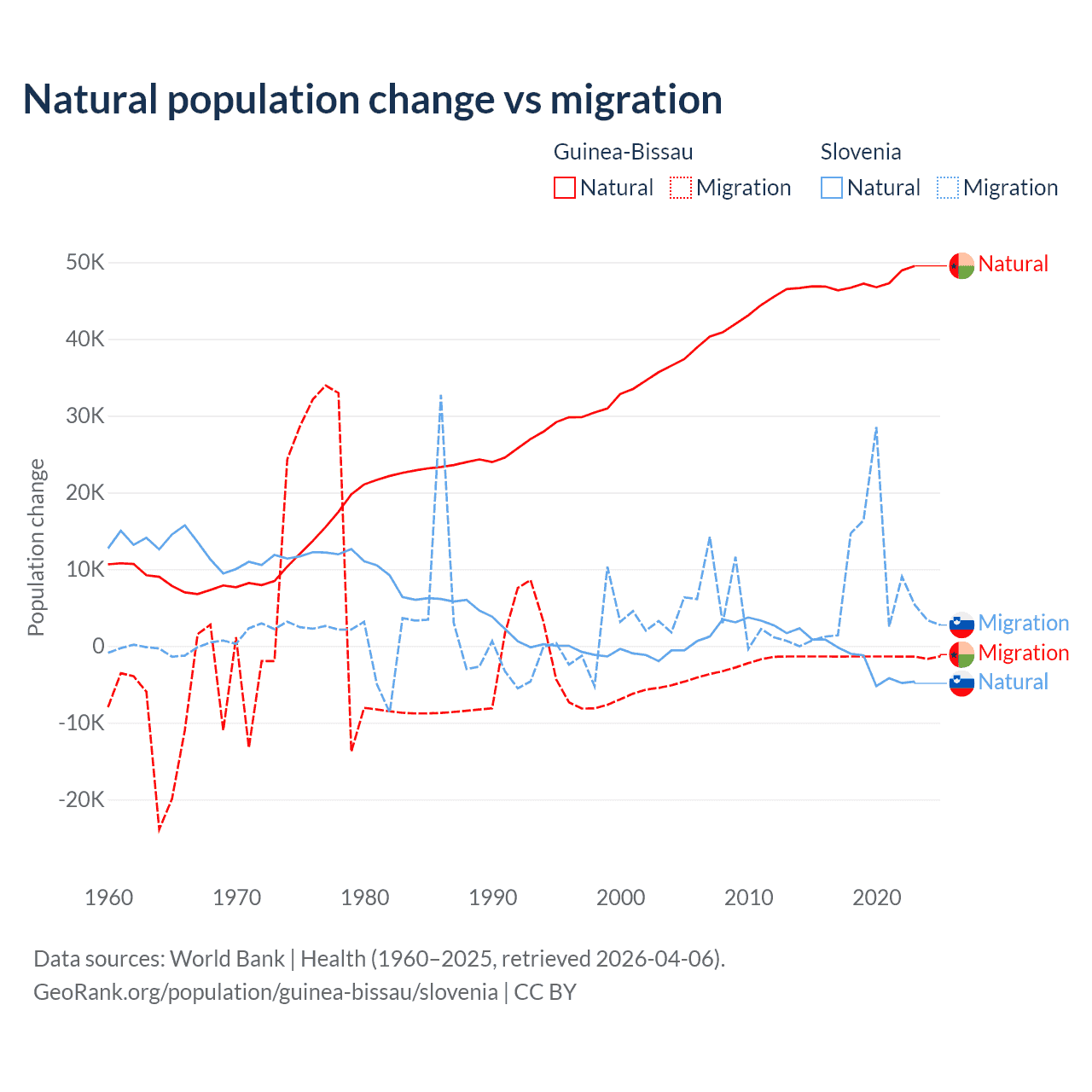 Over the last 10 years, 97.1% of the population change in Guinea-Bissau is from natural causes (a gain of 472,826 people) and 2.87% is from migration (a loss of 13,956 people). In Slovenia 18.1% is from natural causes (a loss of 17,573 people) and 81.9% is from migration (a gain of 79,532 people).