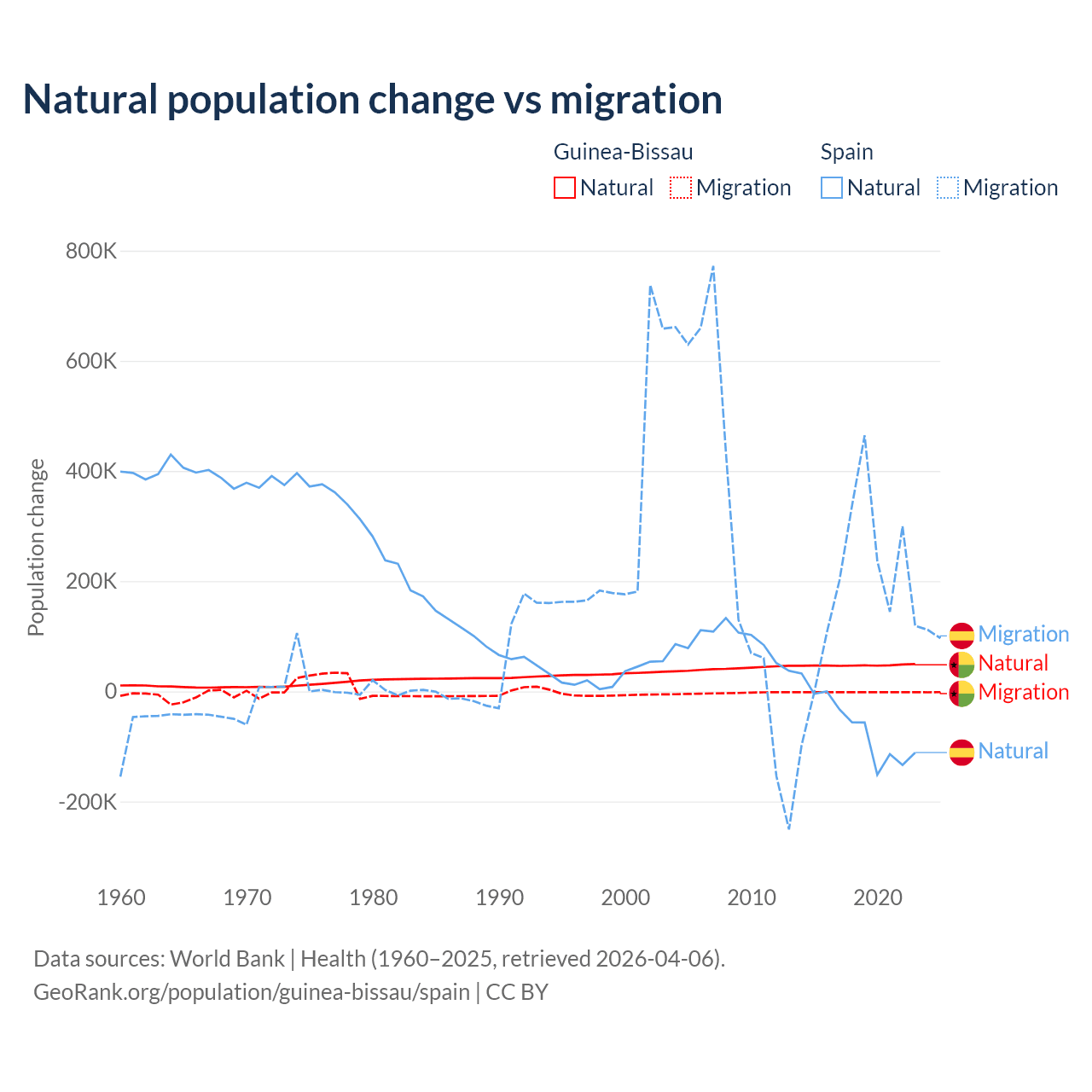 Over the last 10 years, 97.1% of the population change in Guinea-Bissau is from natural causes (a gain of 472,826 people) and 2.87% is from migration (a loss of 13,956 people). In Spain 25.8% is from natural causes (a loss of 627,829 people) and 74.2% is from migration (a gain of 1,810,127 people).