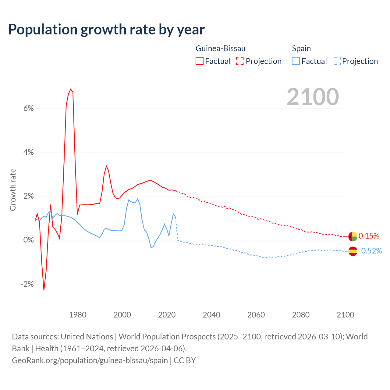 - For the last 10 years, Guinea-Bissau has had an average growth rate of +2.4% per year vs +0.43% in Spain.