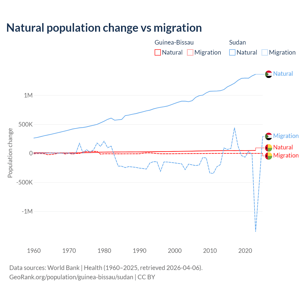 Over the last 10 years, 97.1% of the population change in Guinea-Bissau is from natural causes (a gain of 472,826 people) and 2.87% is from migration (a loss of 13,956 people). In Sudan 95.1% is from natural causes (a gain of 12,459,977 people) and 4.88% is from migration (a loss of 639,596 people).