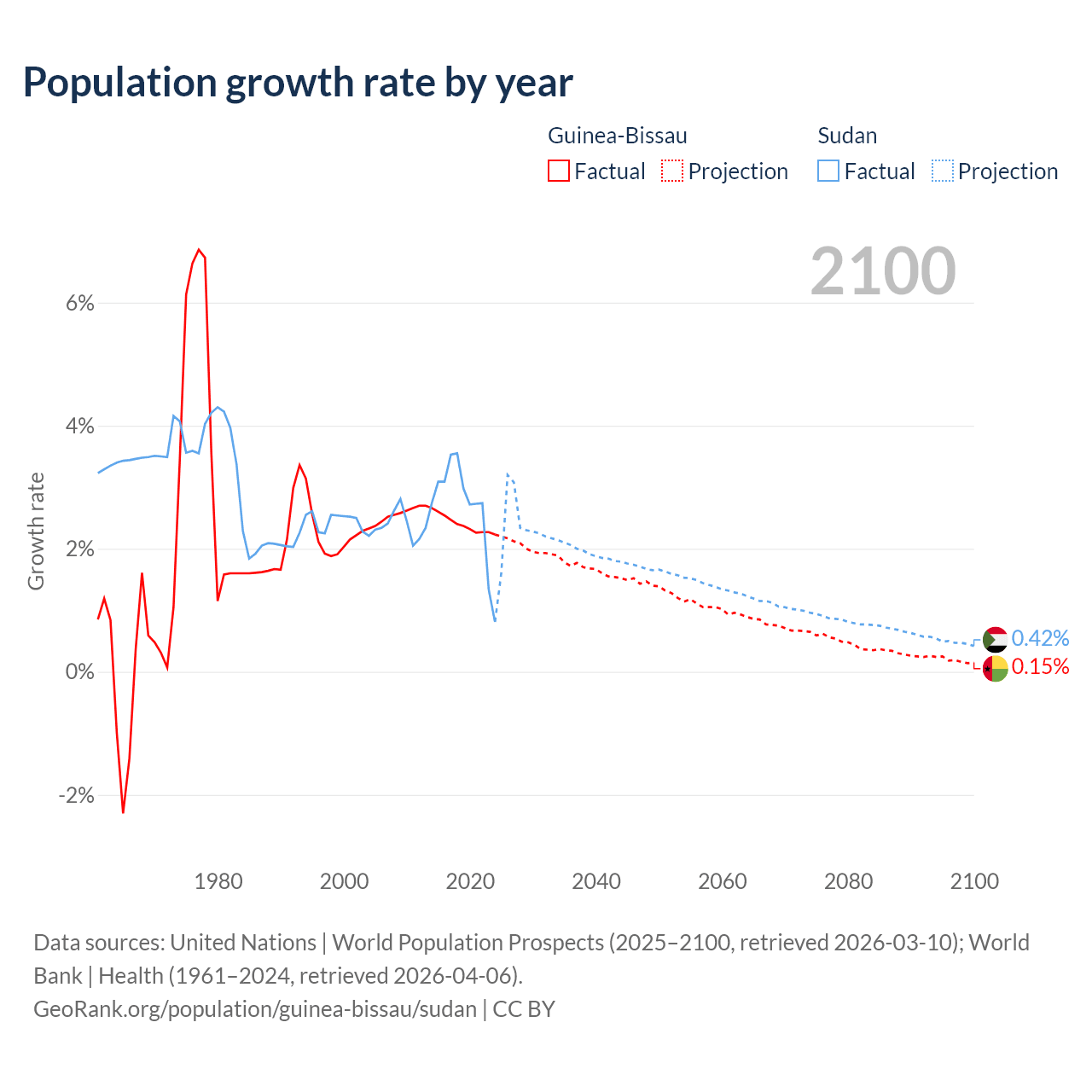- For the last 10 years, Guinea-Bissau has had an average growth rate of +2.4% per year vs +2.67% in Sudan.