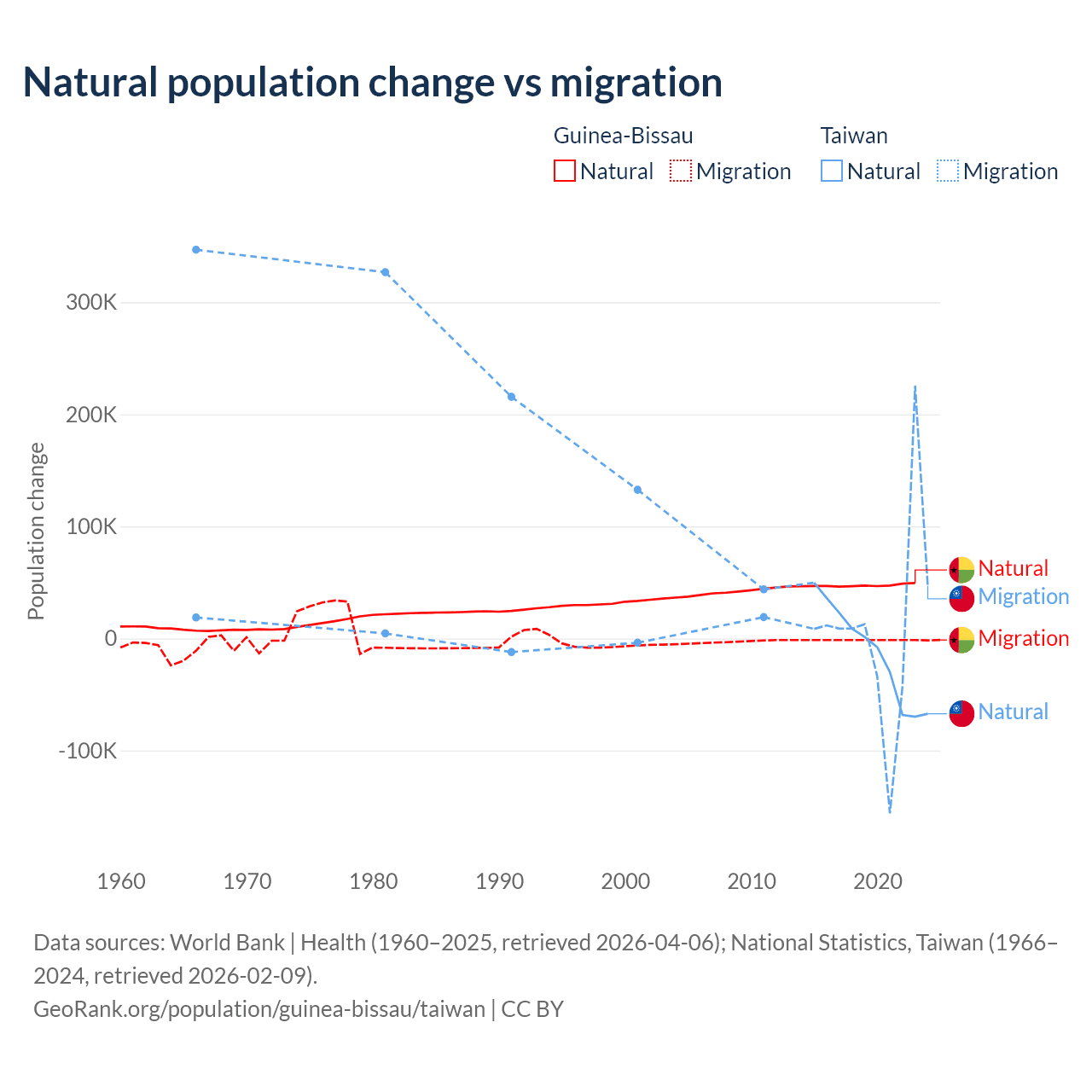 Over the last 10 years, 97.1% of the population change in Guinea-Bissau is from natural causes (a gain of 472,826 people) and 2.87% is from migration (a loss of 13,956 people). In Taiwan 56.7% is from natural causes (a loss of 57,467 people) and 43.3% is from migration (a gain of 43,884 people).