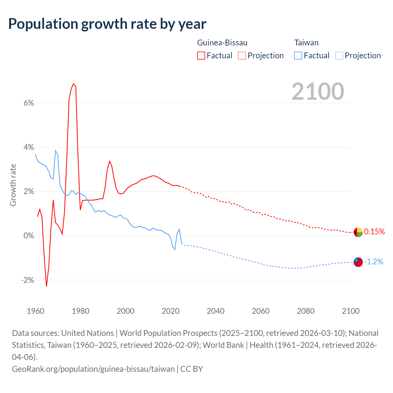 Data sources: World Bank | Health (1960–2024, retrieved 2026-04-06); United Nations | World Population Prospects (1960–2026, retrieved 2026-03-10); U.S. Census Bureau (1960–2025, retrieved 2026-02-08); National Statistics, Taiwan (1960–2025, retrieved 2026-02-09); Central Intelligence Agency (CIA) (2000–2019, retrieved 2026-02-20).