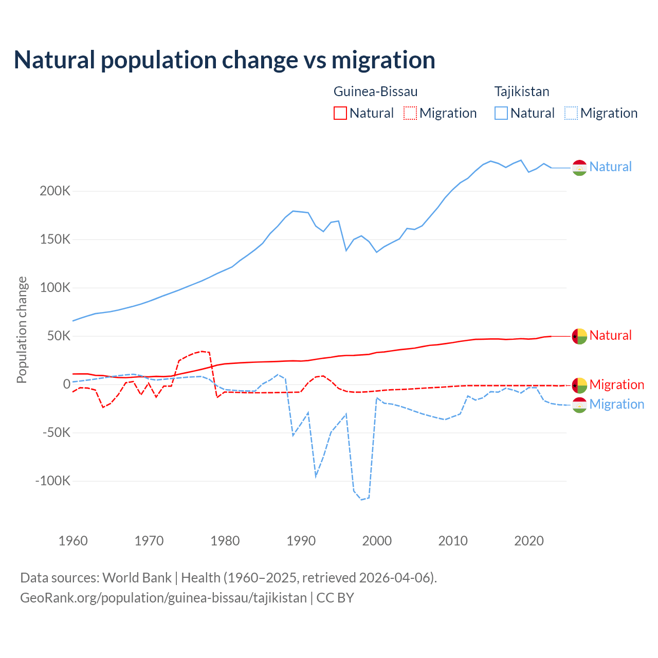Over the last 10 years, 97.1% of the population change in Guinea-Bissau is from natural causes (a gain of 472,826 people) and 2.87% is from migration (a loss of 13,956 people). In Tajikistan 96% is from natural causes (a gain of 2,266,045 people) and 3.95% is from migration (a loss of 93,205 people).