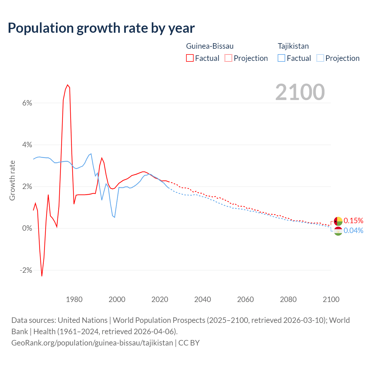Guinea-Bissau vs Tajikistan: population by year and forecast