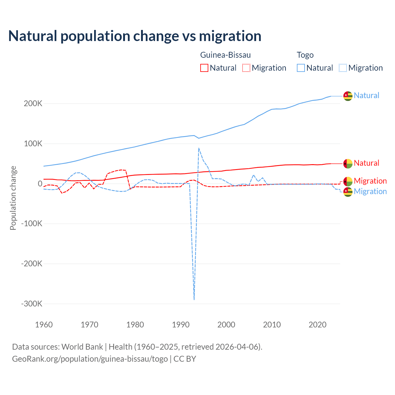 Over the last 10 years, 97.1% of the population change in Guinea-Bissau is from natural causes (a gain of 472,826 people) and 2.87% is from migration (a loss of 13,956 people). In Togo 99.1% is from natural causes (a gain of 2,052,115 people) and 0.86% is from migration (a loss of 17,852 people).