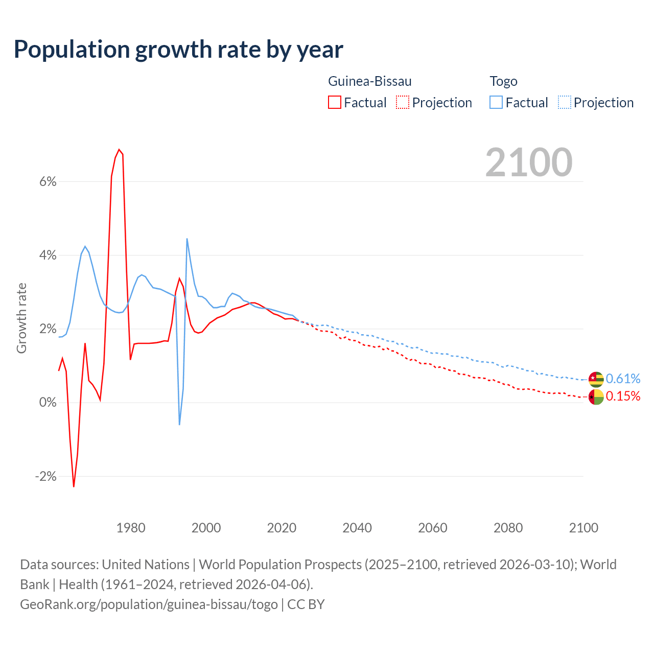 - For the last 10 years, Guinea-Bissau has had an average growth rate of +2.4% per year vs +2.46% in Togo.