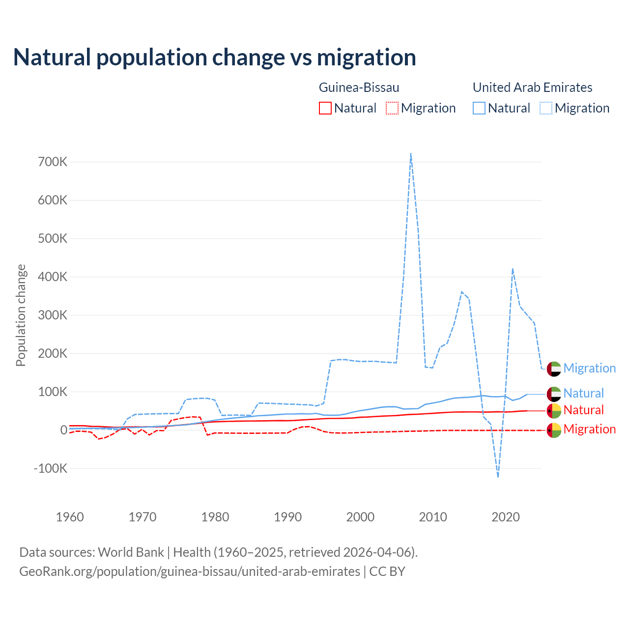 Over the last 10 years, 97.1% of the population change in Guinea-Bissau is from natural causes (a gain of 472,826 people) and 2.87% is from migration (a loss of 13,956 people). In the United Arab Emirates 30.5% is from natural causes (a gain of 857,996 people) and 69.5% is from migration (a gain of 1,958,520 people).