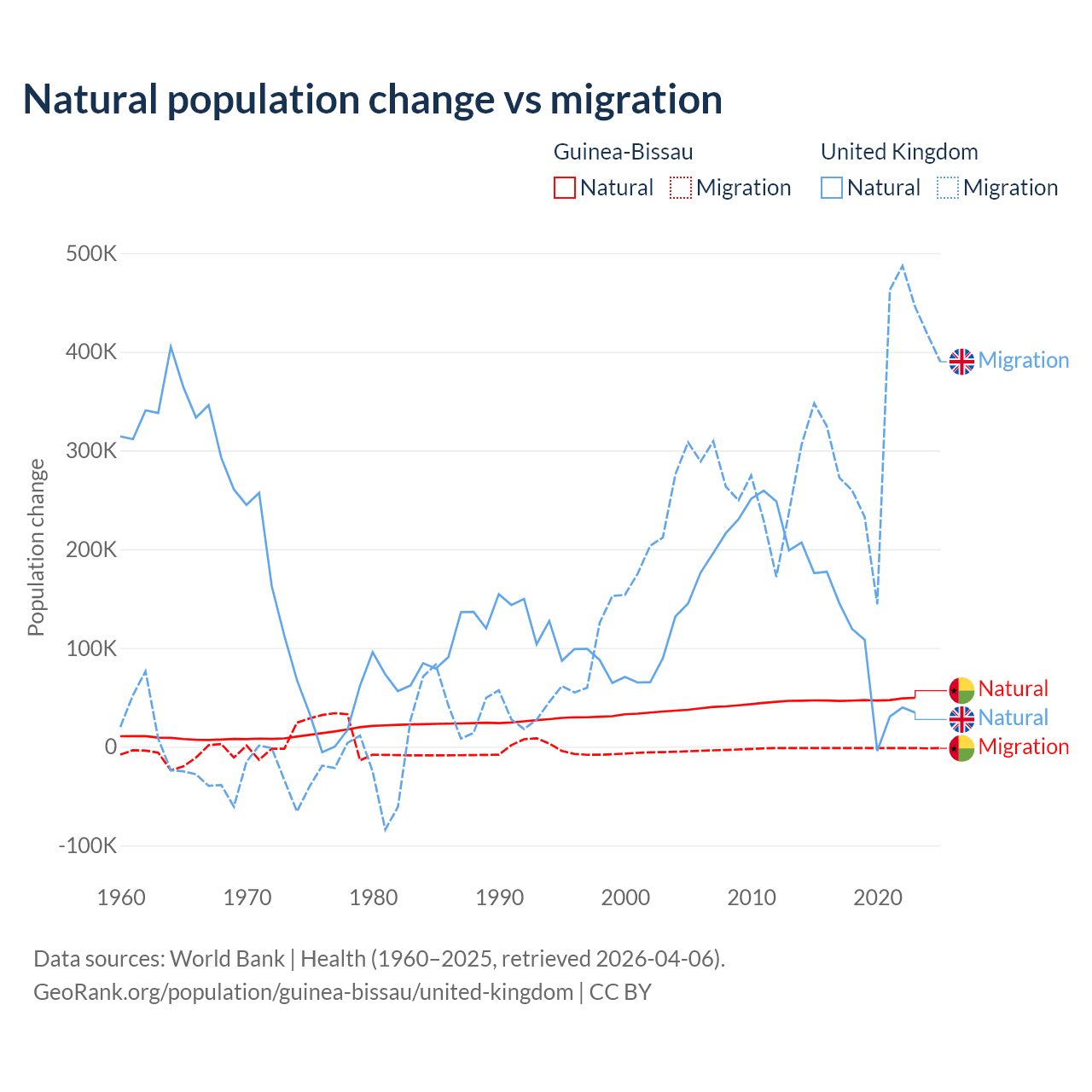 Over the last 10 years, 97.1% of the population change in Guinea-Bissau is from natural causes (a gain of 472,826 people) and 2.87% is from migration (a loss of 13,956 people). In the United Kingdom 23.9% is from natural causes (a gain of 1,033,129 people) and 76.1% is from migration (a gain of 3,283,101 people).