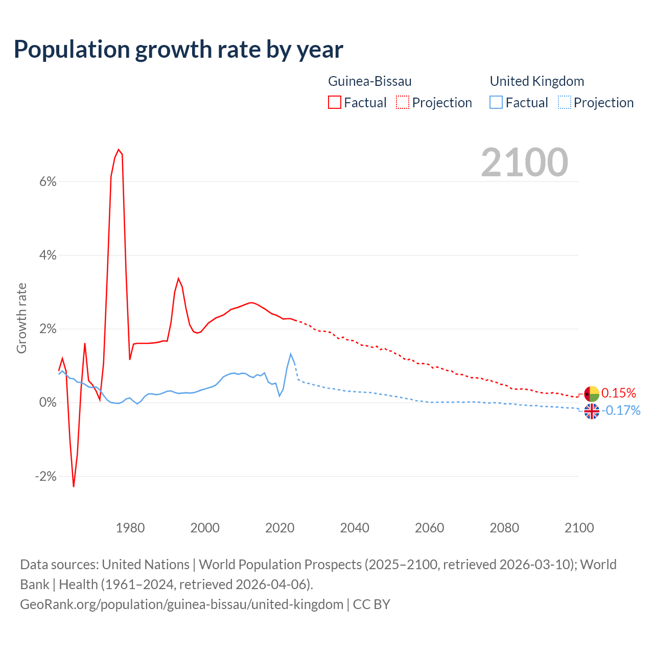 - For the last 10 years, Guinea-Bissau has had an average growth rate of +2.4% per year vs +0.7% in the United Kingdom.