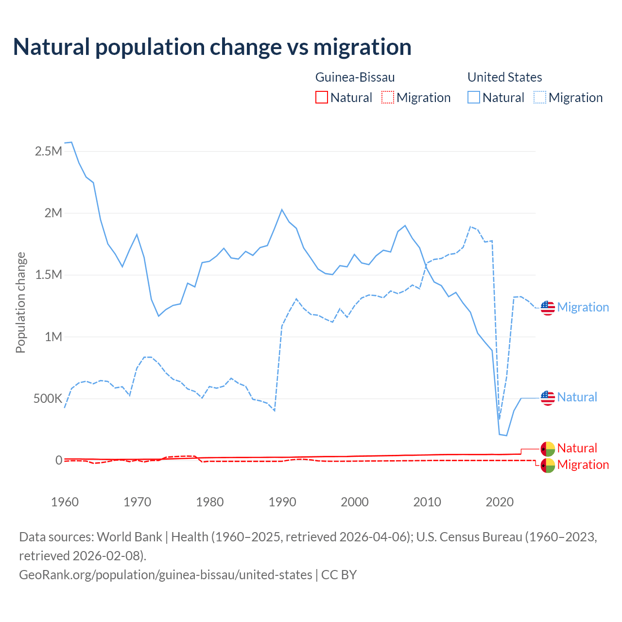Over the last 10 years, 97.1% of the population change in Guinea-Bissau is from natural causes (a gain of 472,826 people) and 2.87% is from migration (a loss of 13,956 people). In the United States 35.8% is from natural causes (a gain of 8,005,866 people) and 64.2% is from migration (a gain of 14,334,286 people).