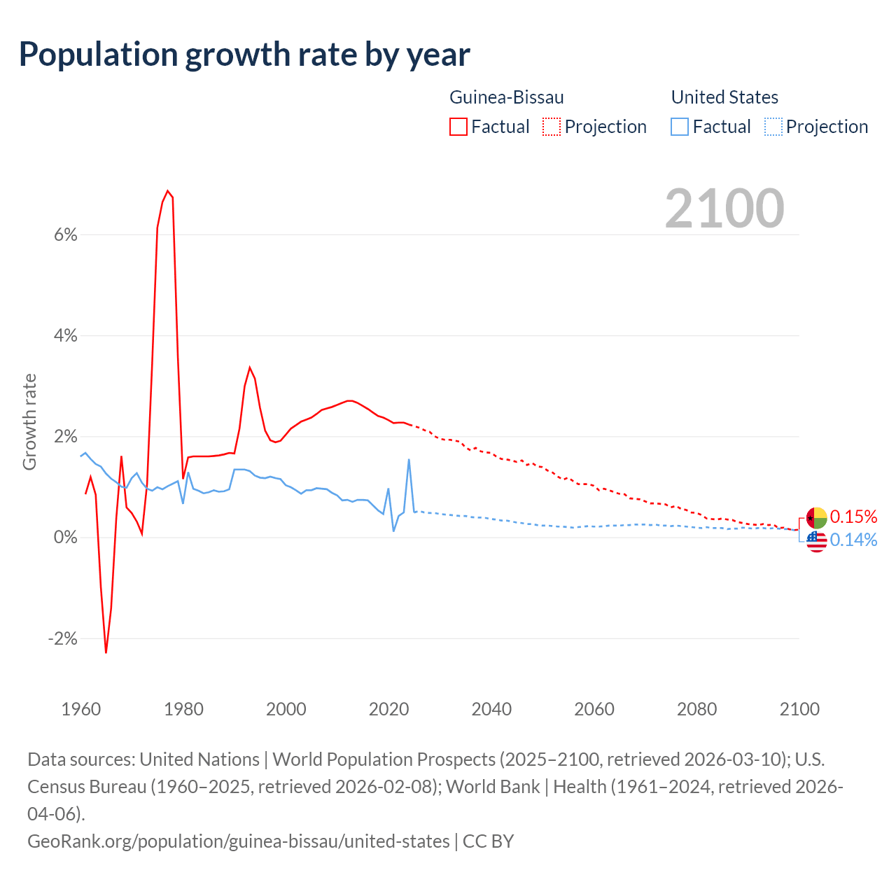 - For the last 10 years, Guinea-Bissau has had an average growth rate of +2.4% per year vs +0.65% in the United States.