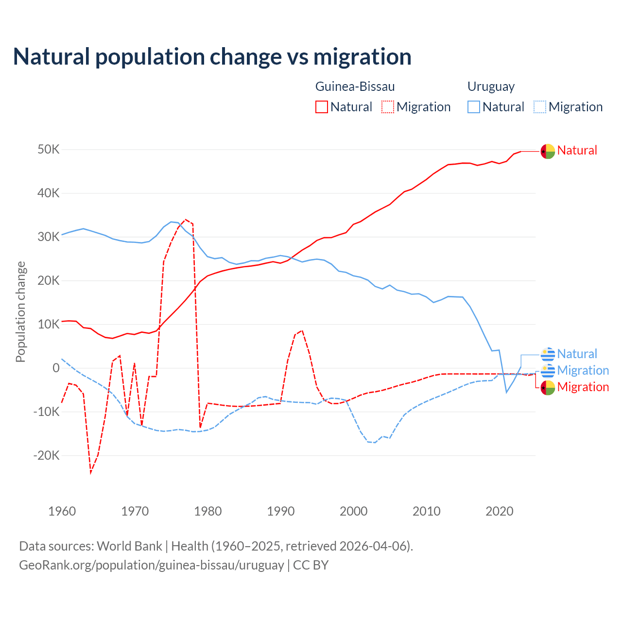 Over the last 10 years, 97.1% of the population change in Guinea-Bissau is from natural causes (a gain of 472,826 people) and 2.87% is from migration (a loss of 13,956 people). In Uruguay 70% is from natural causes (a gain of 64,303 people) and 30% is from migration (a loss of 27,501 people).