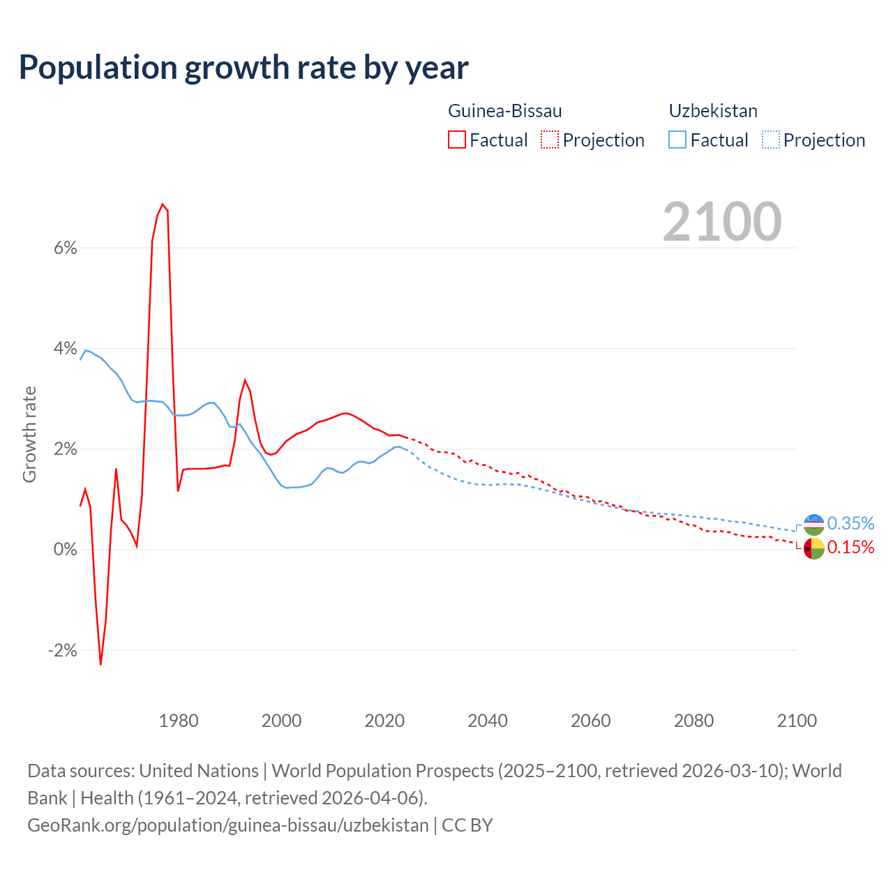 - For the last 10 years, Guinea-Bissau has had an average growth rate of +2.4% per year vs +1.85% in Uzbekistan.