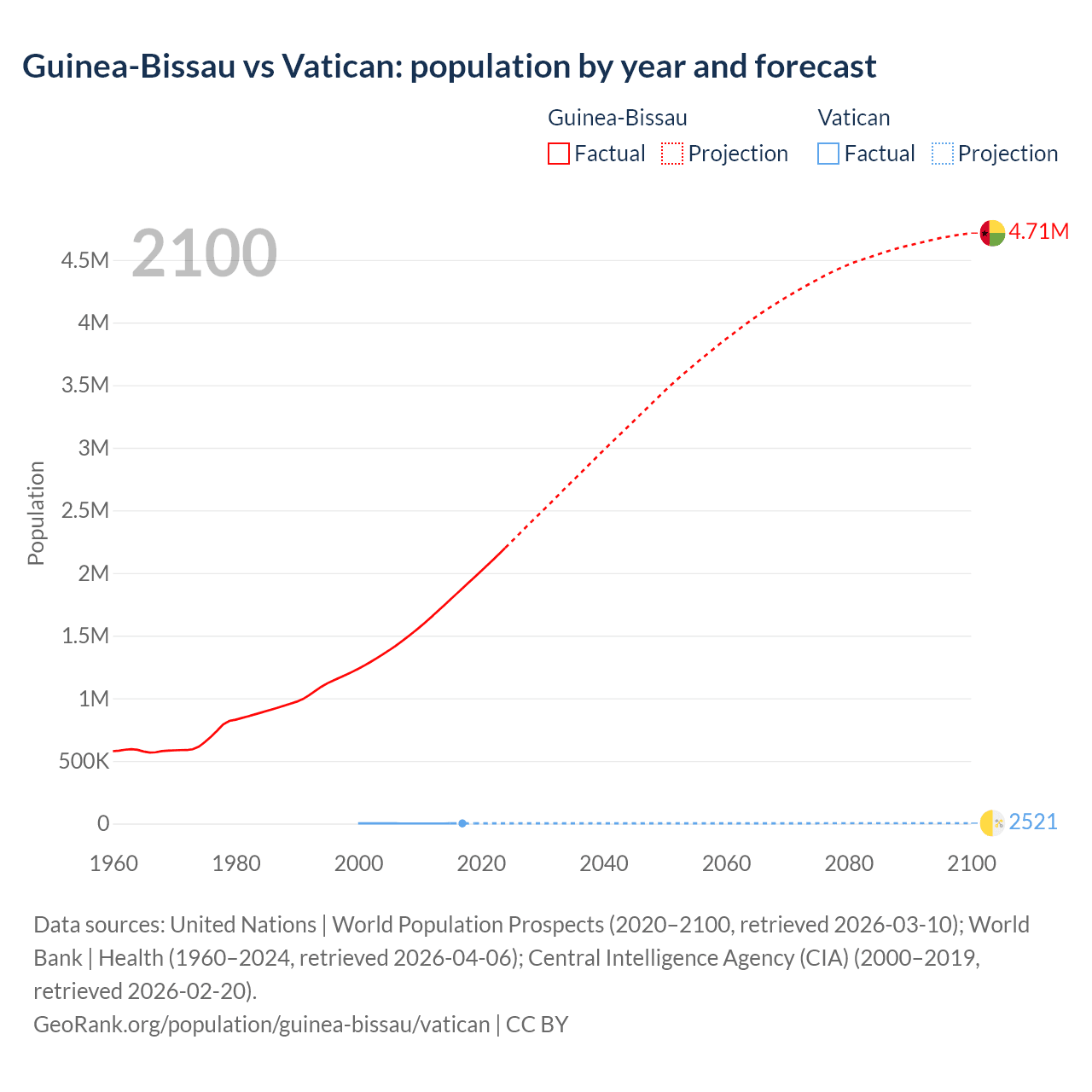 The latest officially reported population of Guinea-Bissau was 2,201,352 in 2024 vs 1,000 people in the Vatican in 2019. In 2026, based on the adjusted UN estimation, the current Guinea-Bissau's population is 2,311,915 people compared to 936 in the Vatican.