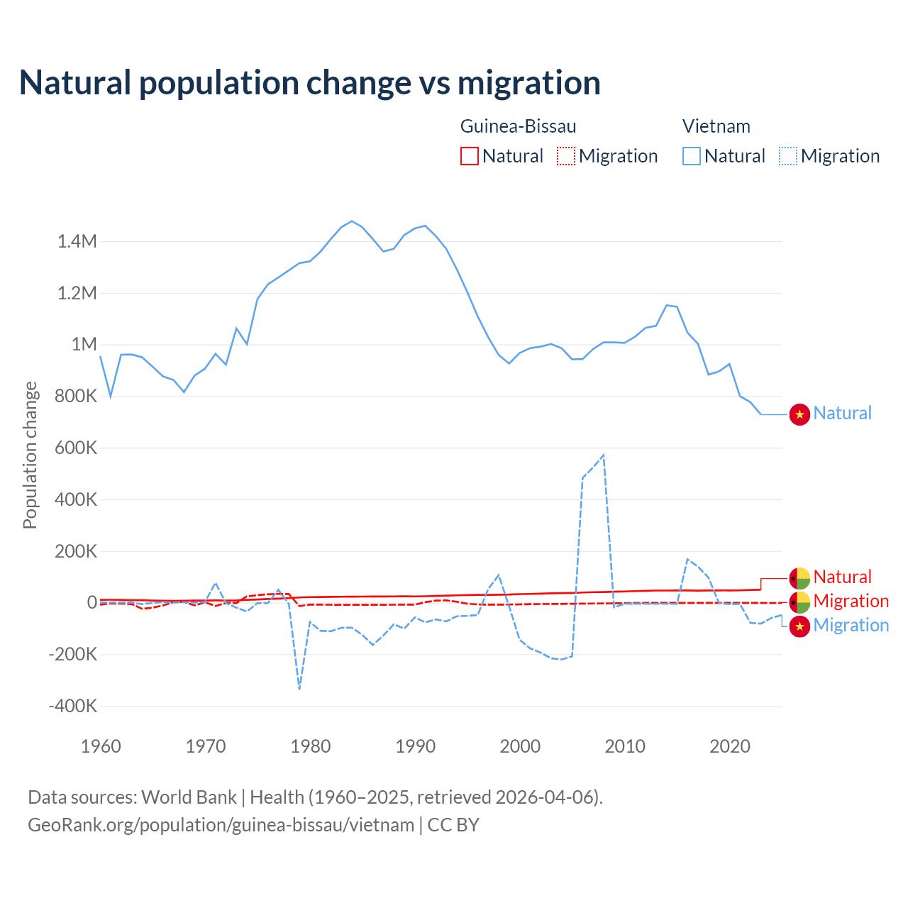 Over the last 10 years, 97.1% of the population change in Guinea-Bissau is from natural causes (a gain of 472,826 people) and 2.87% is from migration (a loss of 13,956 people). In Vietnam 97.7% is from natural causes (a gain of 9,349,756 people) and 2.29% is from migration (a gain of 219,073 people).