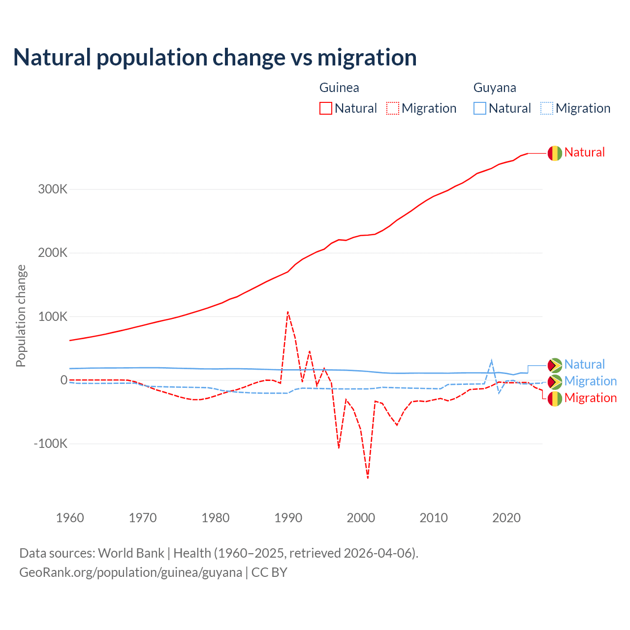 Over the last 10 years, 97.2% of the population change in Guinea is from natural causes (a gain of 3,346,936 people) and 2.76% is from migration (a loss of 94,924 people). In Guyana 77.7% is from natural causes (a gain of 107,419 people) and 22.3% is from migration (a loss of 30,797 people).