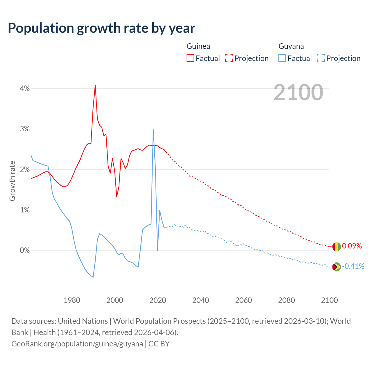- For the last 10 years, Guinea has had an average growth rate of +2.54% per year vs +0.94% in Guyana.