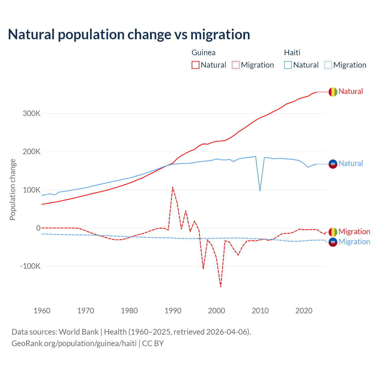Over the last 10 years, 97.2% of the population change in Guinea is from natural causes (a gain of 3,346,936 people) and 2.76% is from migration (a loss of 94,924 people). In Haiti 83.9% is from natural causes (a gain of 1,740,319 people) and 16.1% is from migration (a loss of 333,076 people).