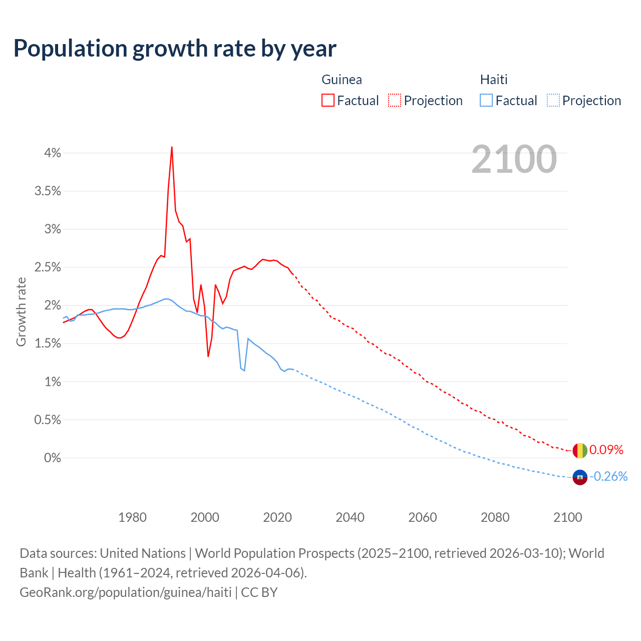 - For the last 10 years, Guinea has had an average growth rate of +2.54% per year vs +1.29% in Haiti.